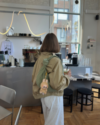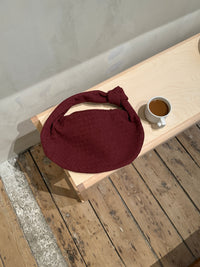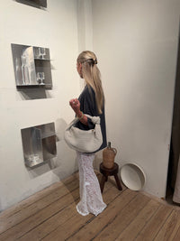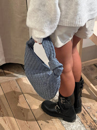 Our Florence shoulder bag in a new suede version. The bag features a round shape with a woven/plaited design and knot detail. It has a spacious main compartment with a zipper closure, and a smaller zippered pocket inside. Perfect for a day out in the city or for everyday use.