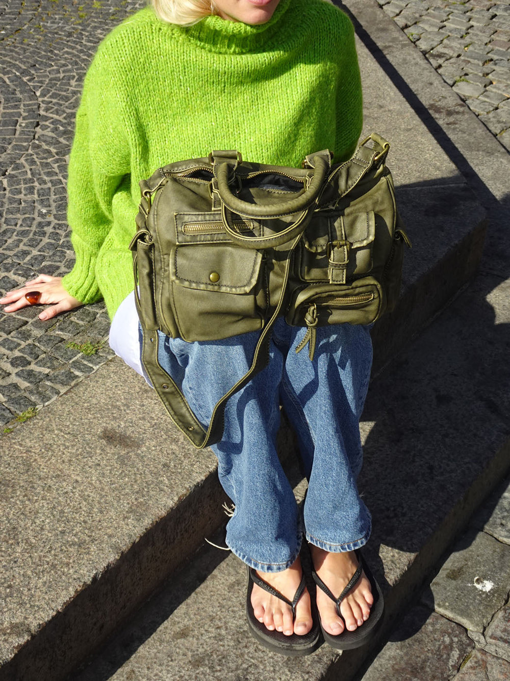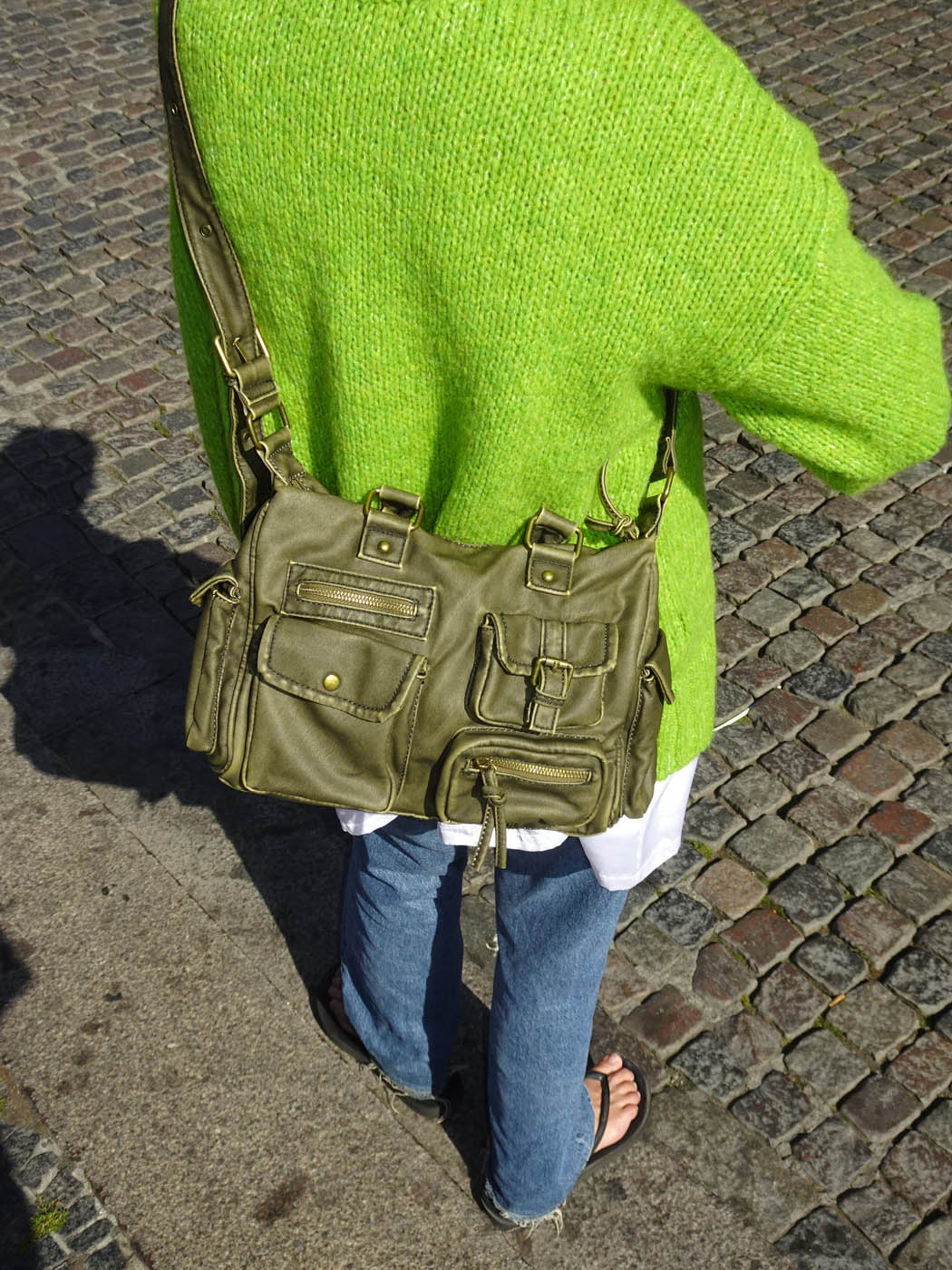 Gamil is a practical and spacious shoulder bag made of faux leather with a slightly worn look. The bag features multiple exterior pockets with zippers and buckles, offering both a rugged style and plenty of functionality – perfect for everyday essentials.