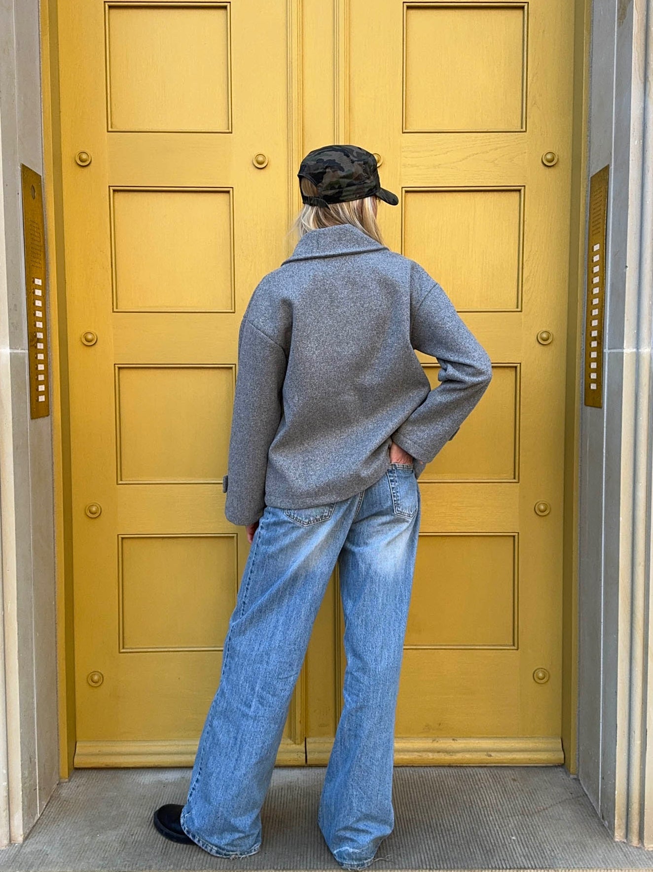 This jacket has a short and loose fit. The jacket has wide lapels and 2 large side pockets. It closes with a double button closure at the front and has the finest sleeves with a strap and button detail at the end.