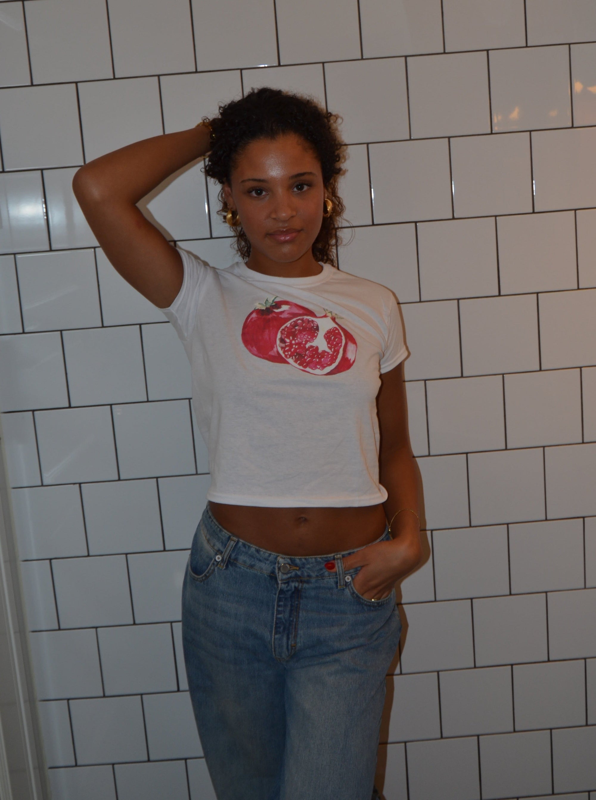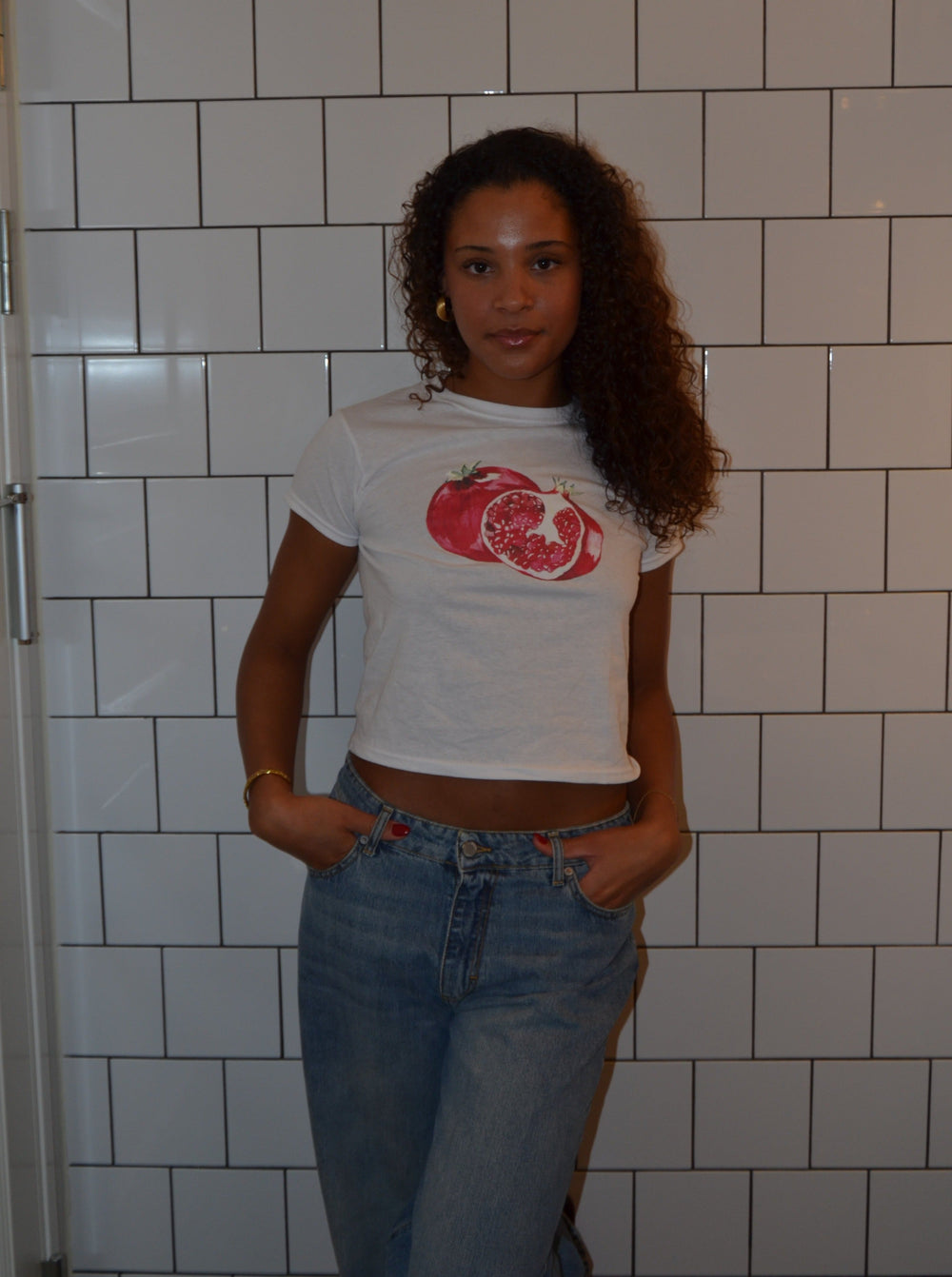 Baby tee with a "Pomegranate" on it. Our tees are from fruit of the loom and in a super soft and comfortable quality.