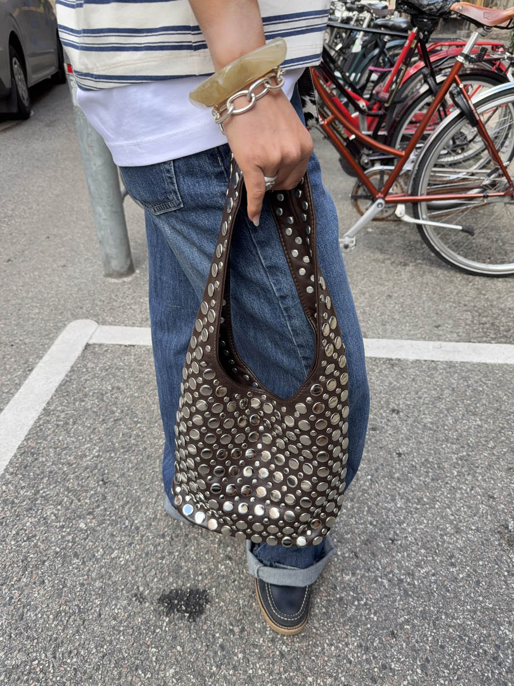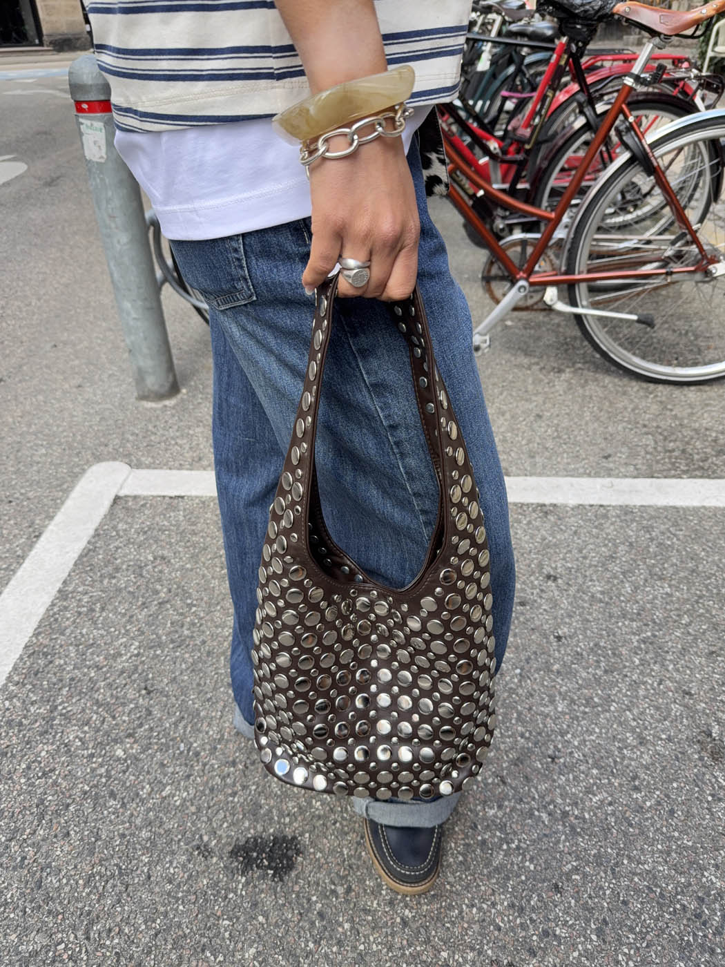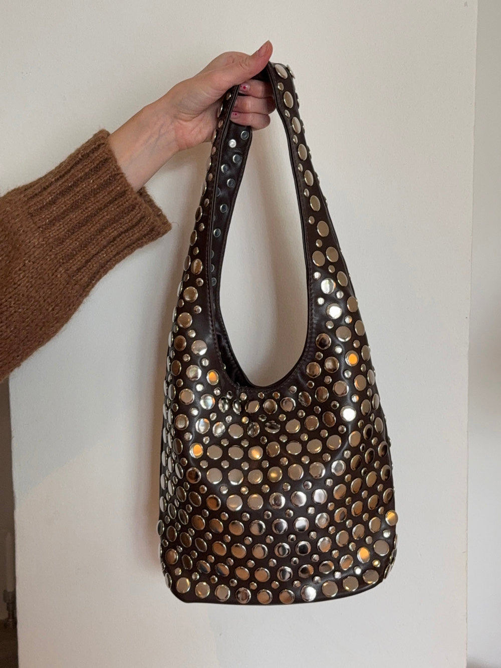 Zula is a striking and eye-catching handbag in brown leather-look material, covered in shiny silver studs in various sizes. The bag’s bold design exudes a rock’n’roll attitude and urban style – perfect for those who want to make a strong statement with their outfit.