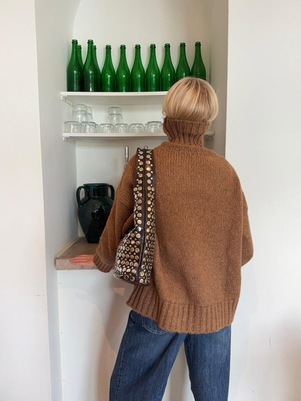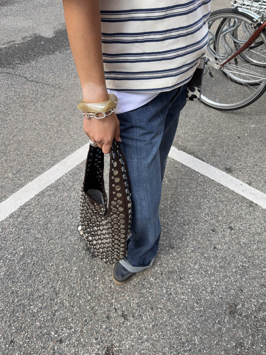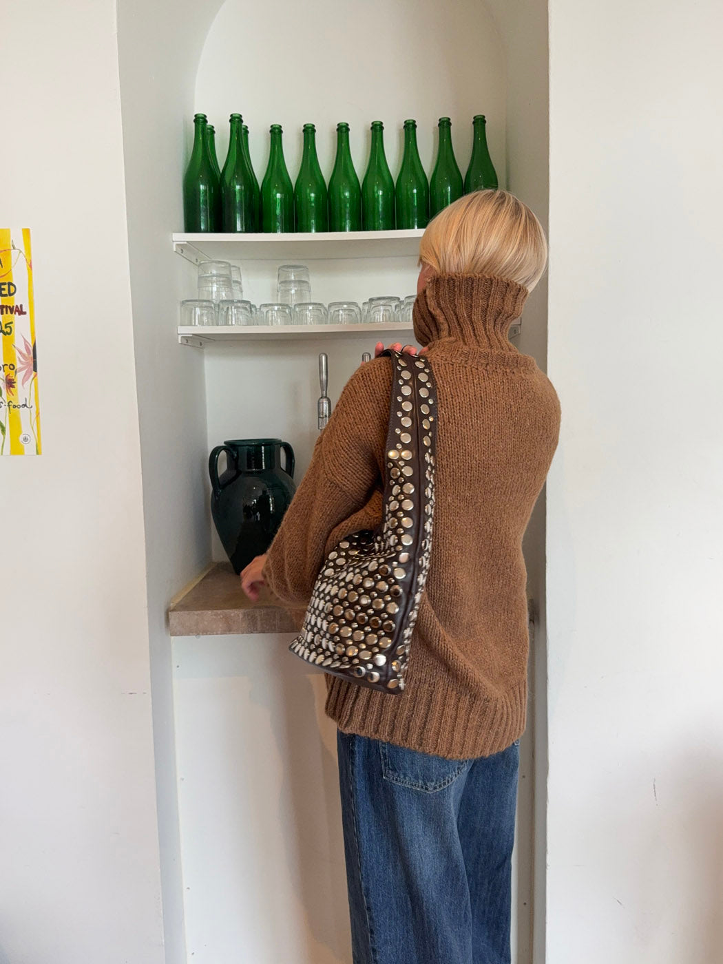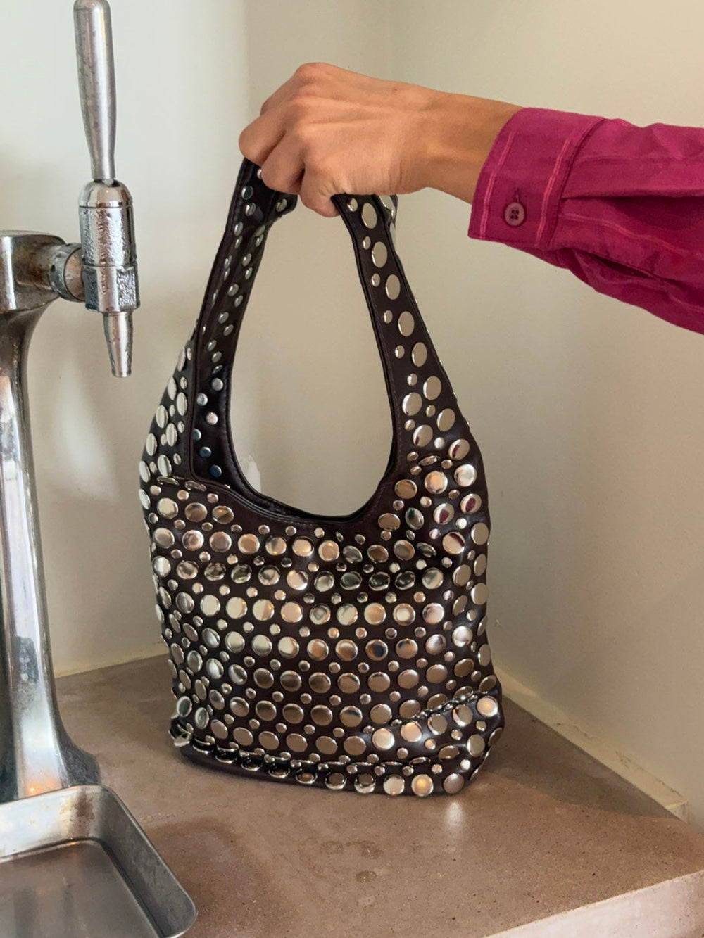 Zula is a striking and eye-catching handbag in brown leather-look material, covered in shiny silver studs in various sizes. The bag’s bold design exudes a rock’n’roll attitude and urban style – perfect for those who want to make a strong statement with their outfit.