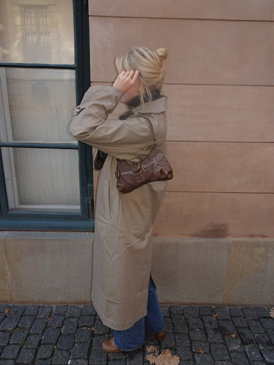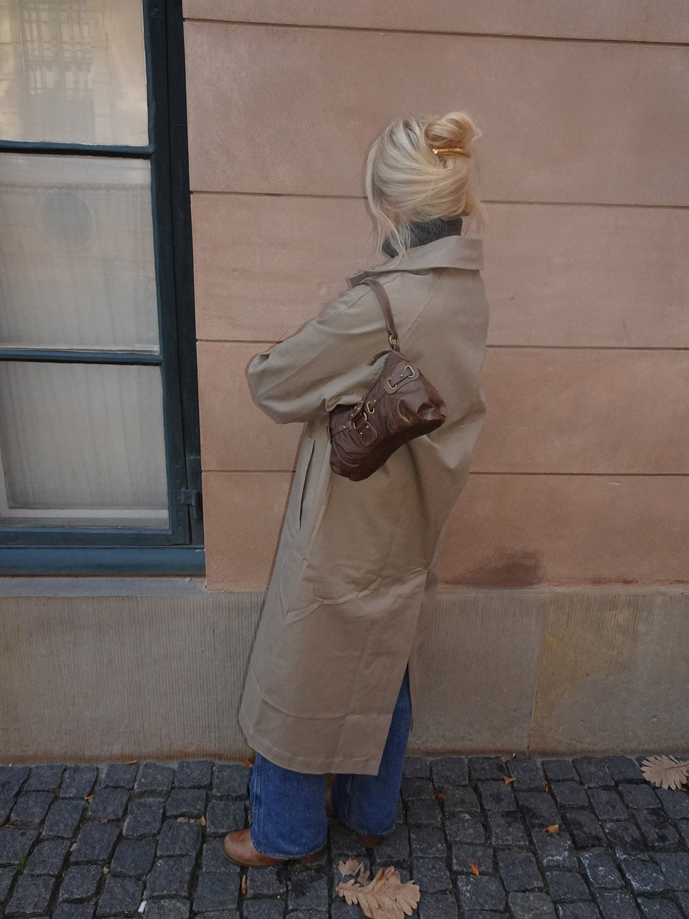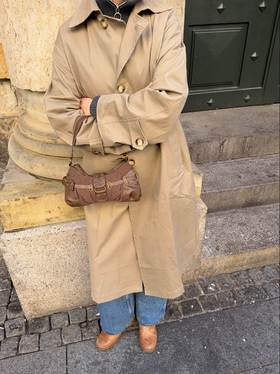 Teddy is a trendy brown handbag featuring a combination of soft fabric and leather-look details. The bag is adorned with decorative straps, buckles, and golden metal rings, giving it a bold and modern edge. Its compact size makes it perfect for your everyday essentials, while the wide strap ensures comfortable wear. A smart and versatile bag that adds a stylish touch to any outfit.