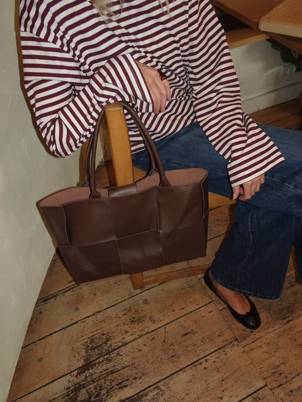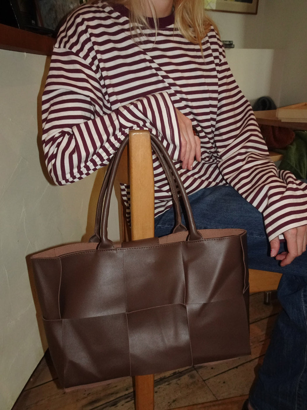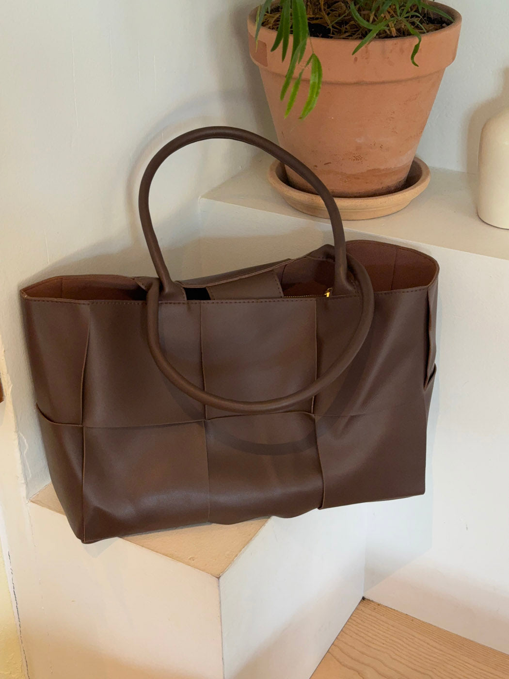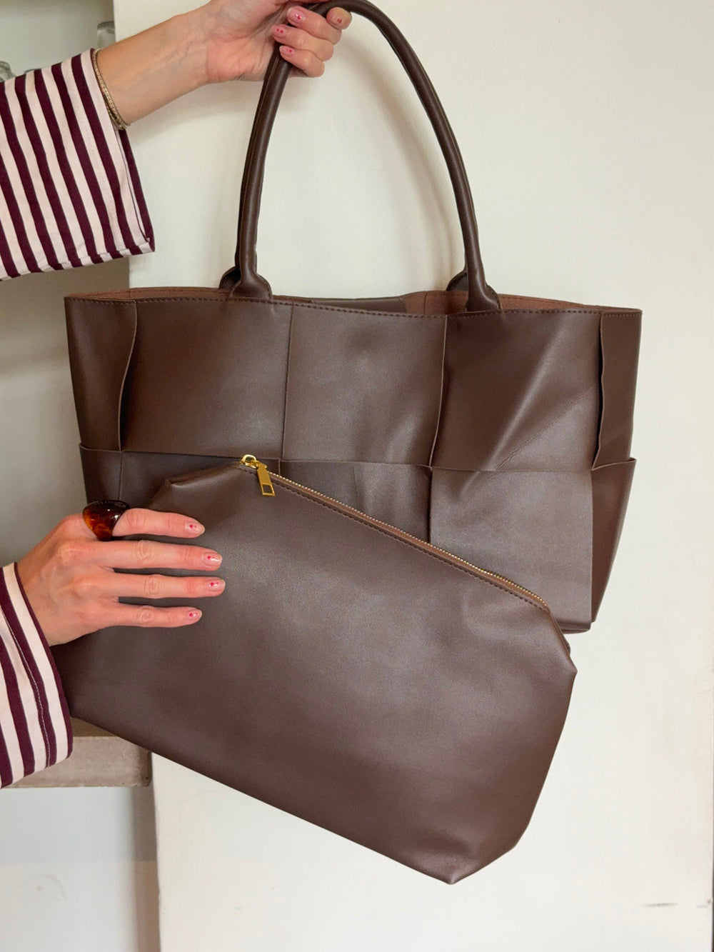 Kaia is a spacious and stylish handbag made from soft brown faux leather. The woven design gives the bag a modern and sophisticated look, while the double handles make it practical to carry. A perfect blend of functionality and elegance for both everyday use and work.