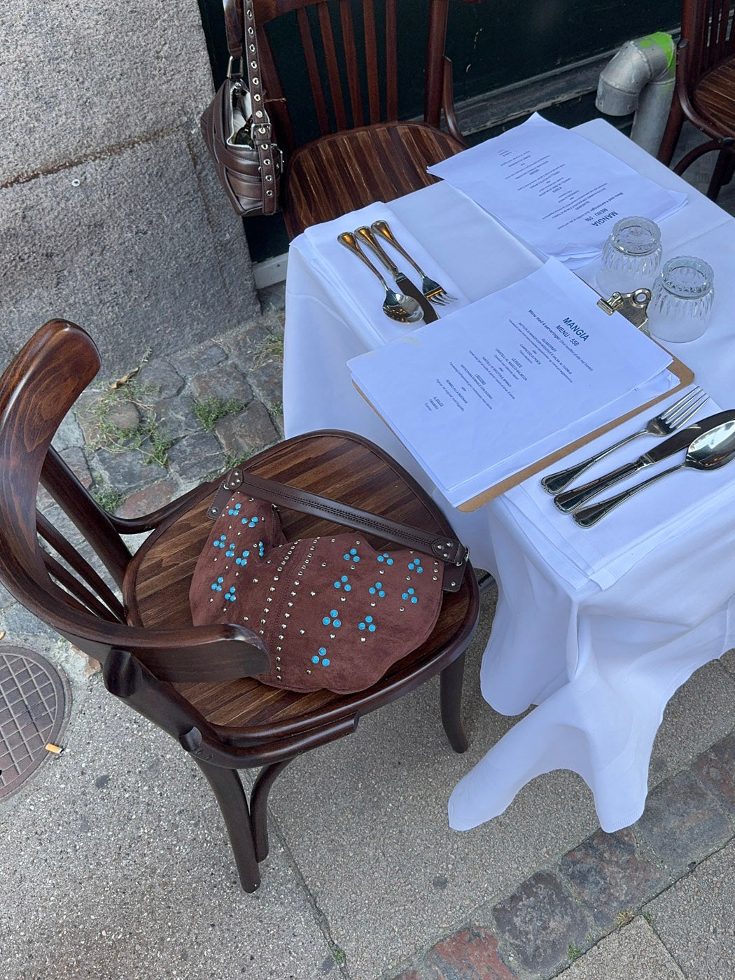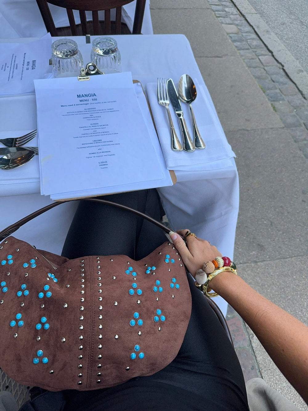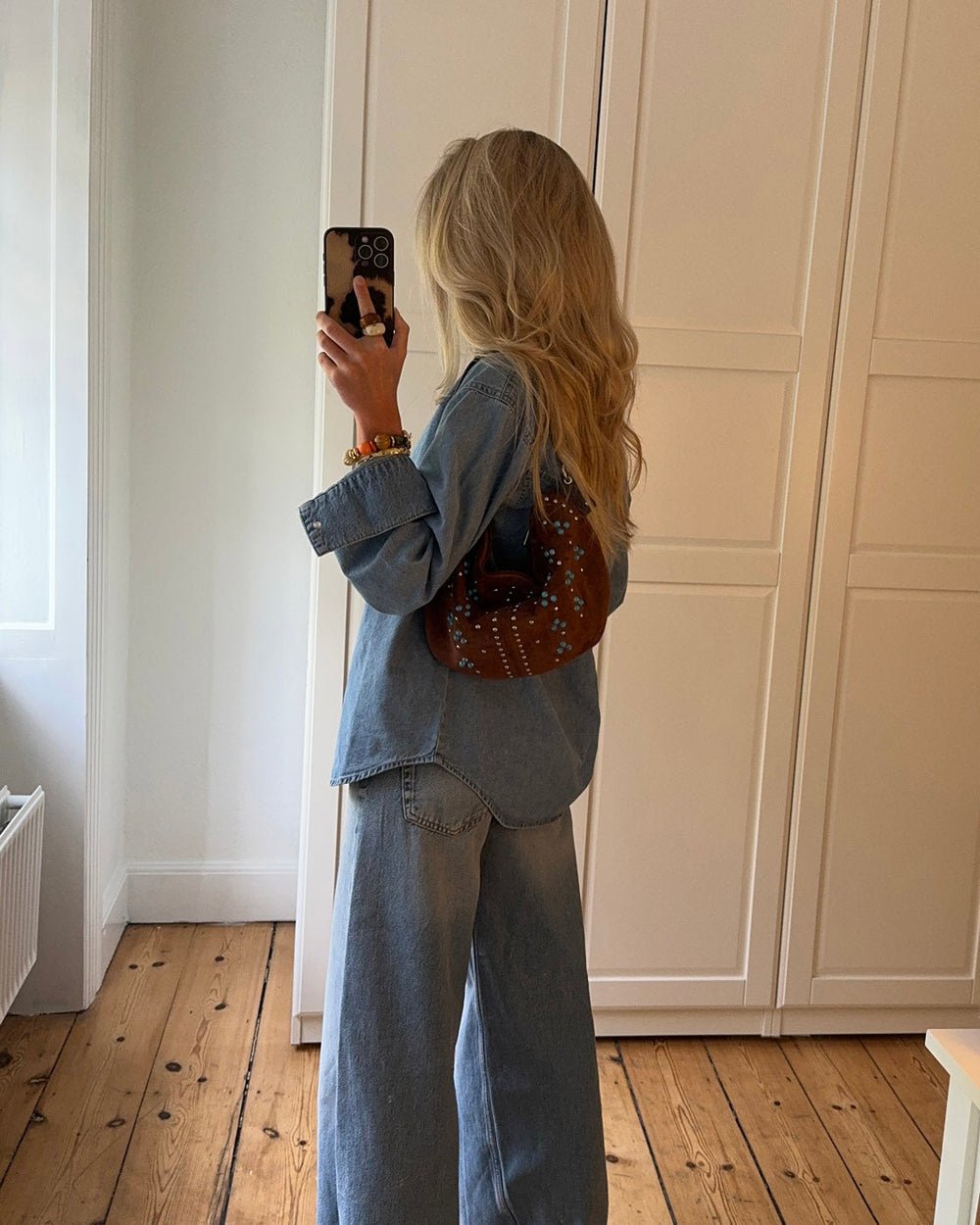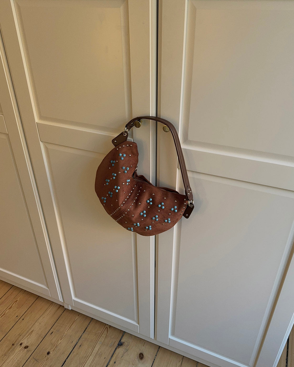 A unique handbag with a bohemian flair, crafted from soft brown suede. Adorned with silver studs and turquoise stones arranged in a symmetrical pattern, it offers an authentic and eye-catching charm. Perfect for adding an artistic and personal touch to your outfit.
