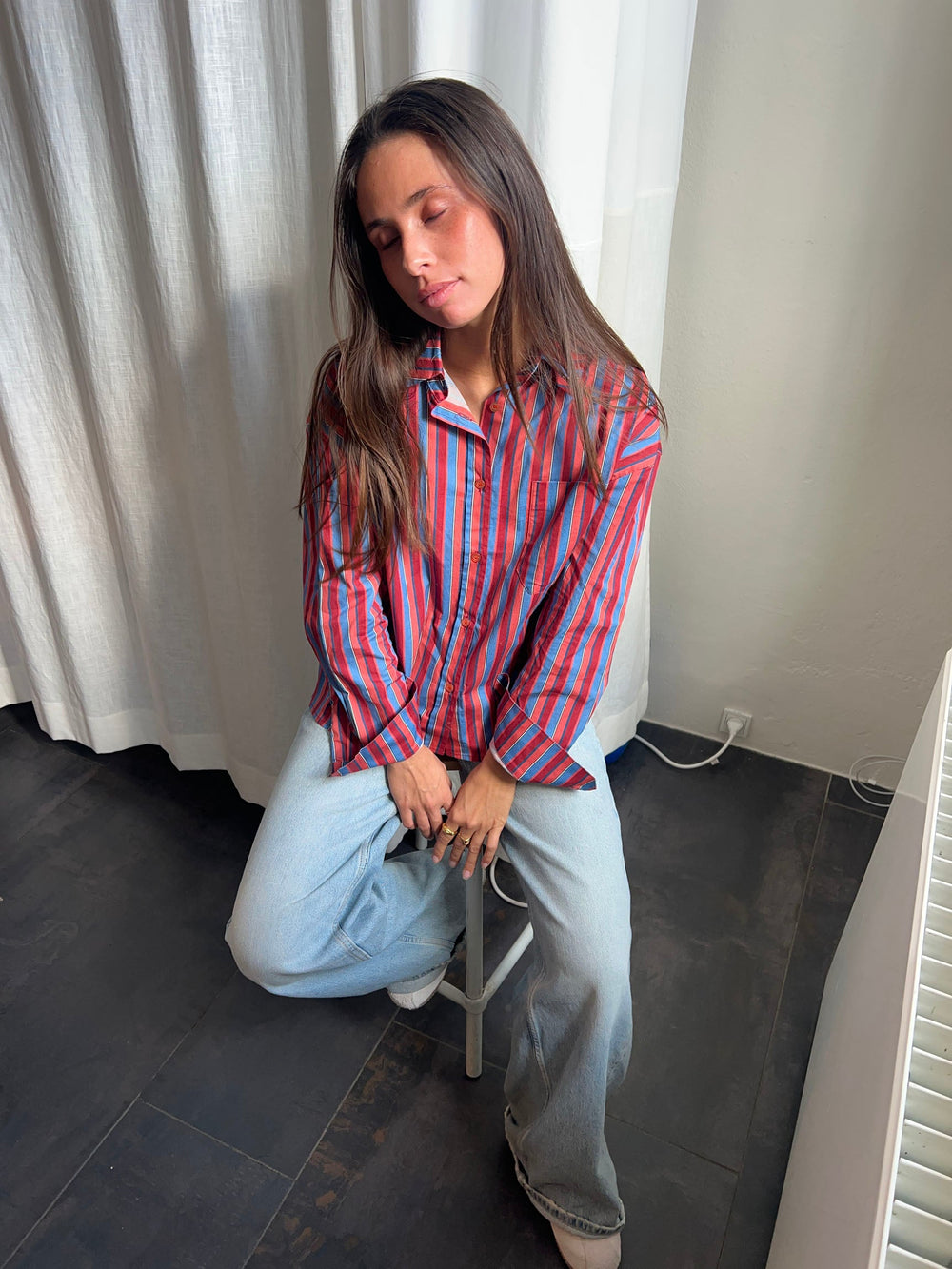 The perfect shirt with pink and blue stripes, ideal for all seasons. It’s sleek and goes with everything in your wardrobe! It has a loose and relaxed fit and fastens with buttons at the front. The shirt features a slit at the back.