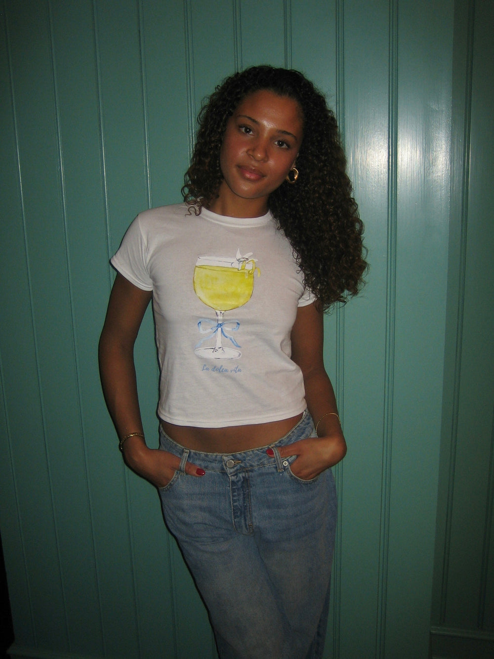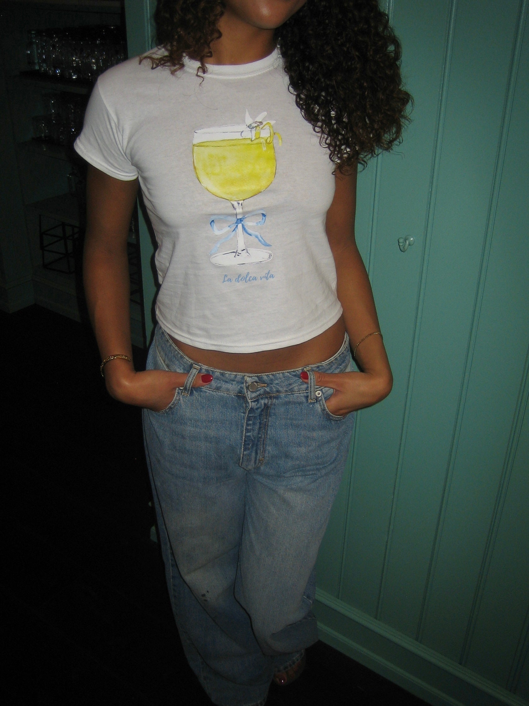 Baby tee with the text "La dolca vita" and a print of a drink with a bow on top. Our tees are from fruit of the loom and in a super soft and comfortable quality.