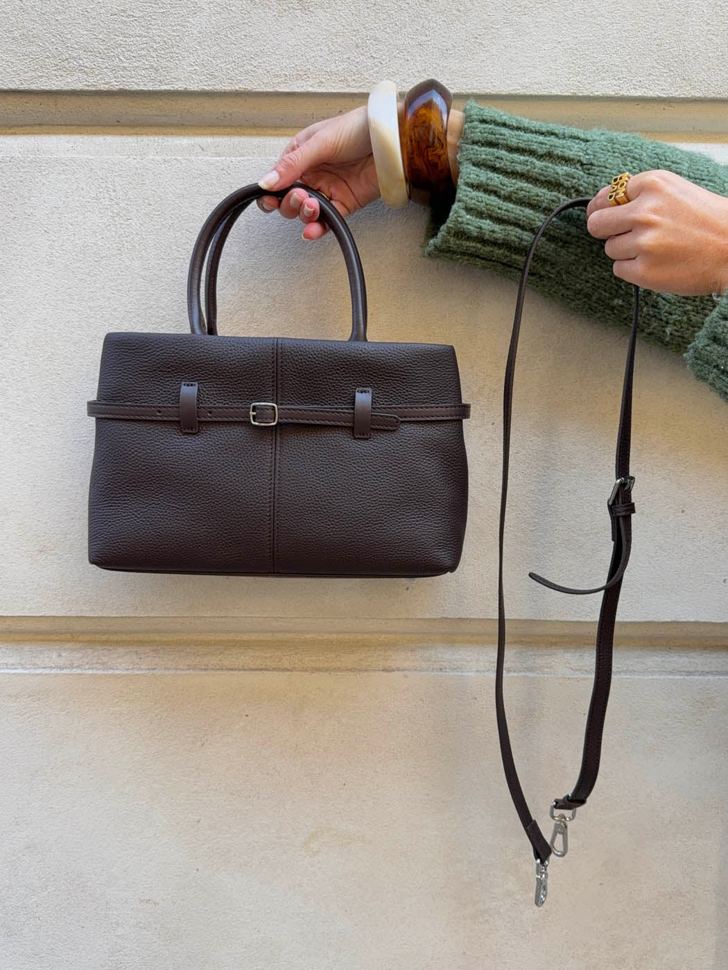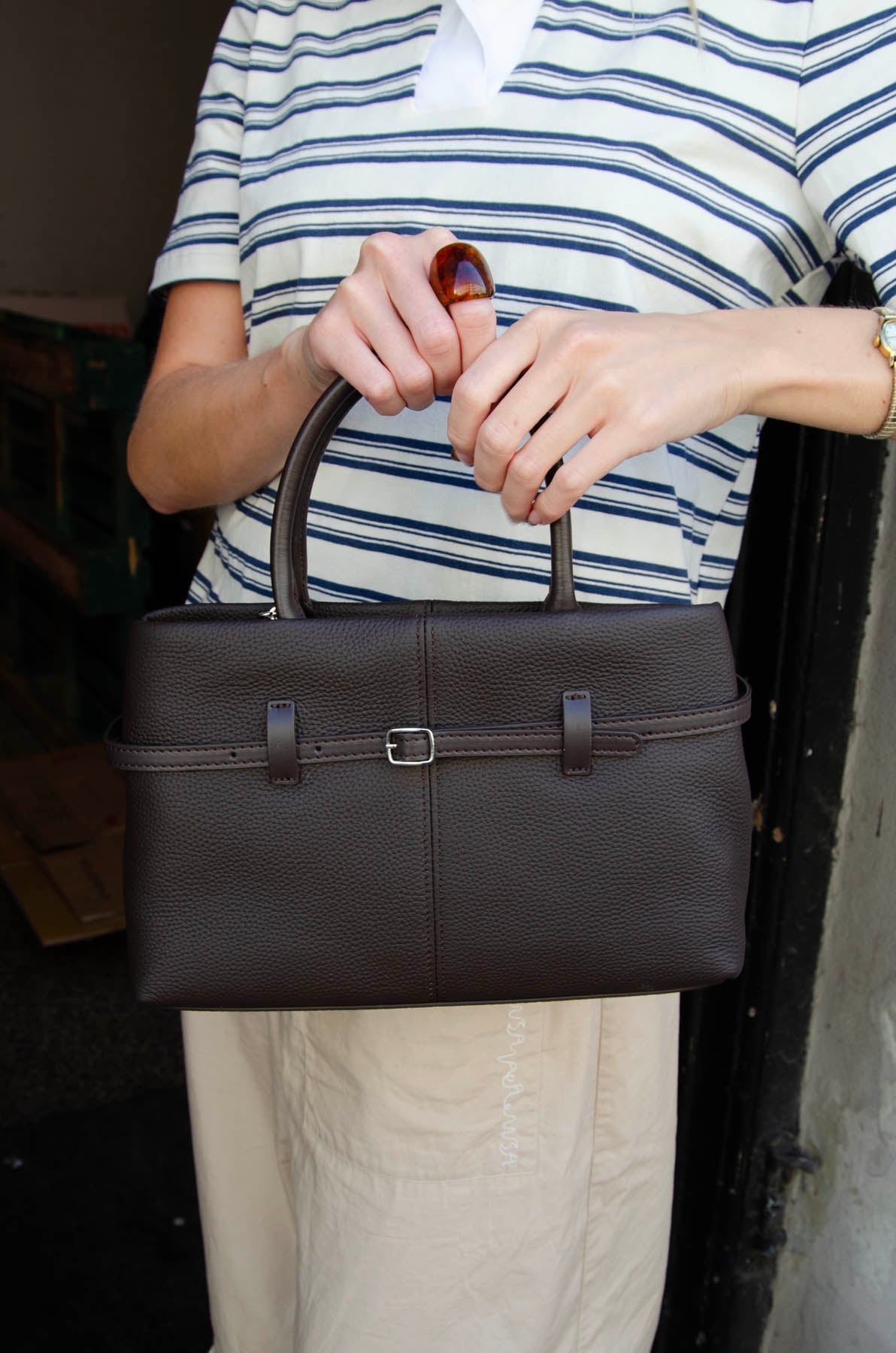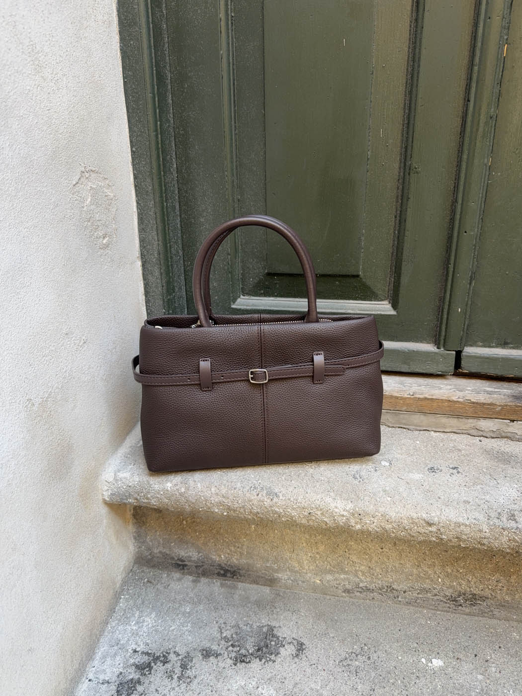 A stylish and classic handbag in brown faux leather, featuring an elegant tie detail on the front. The bag has a structured shape and timeless design, making it perfect for both work and everyday use. The double handles provide a sturdy and comfortable grip, while the spacious interior makes it easy to keep your belongings organized. A versatile bag that combines functionality with sophisticated style.