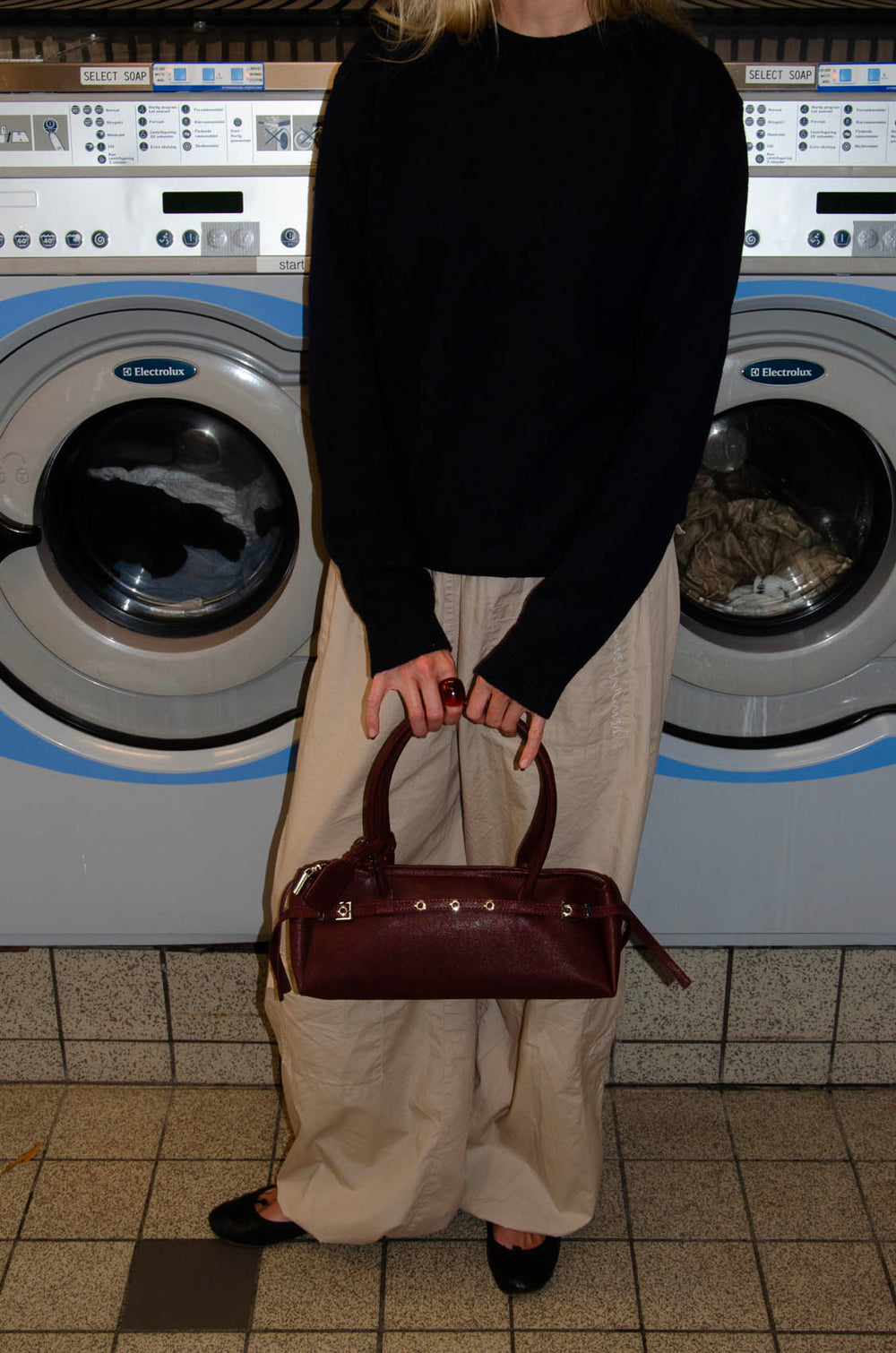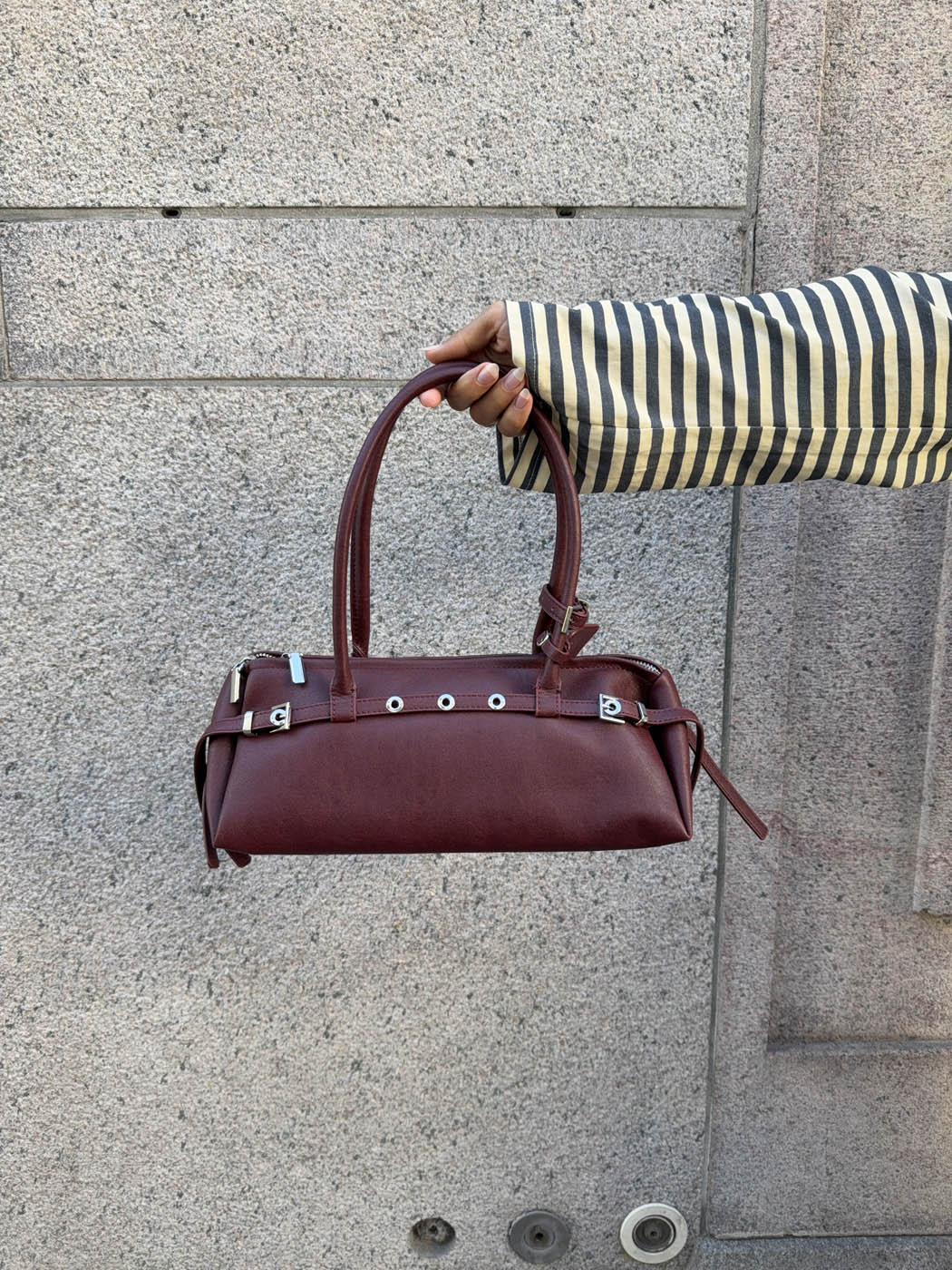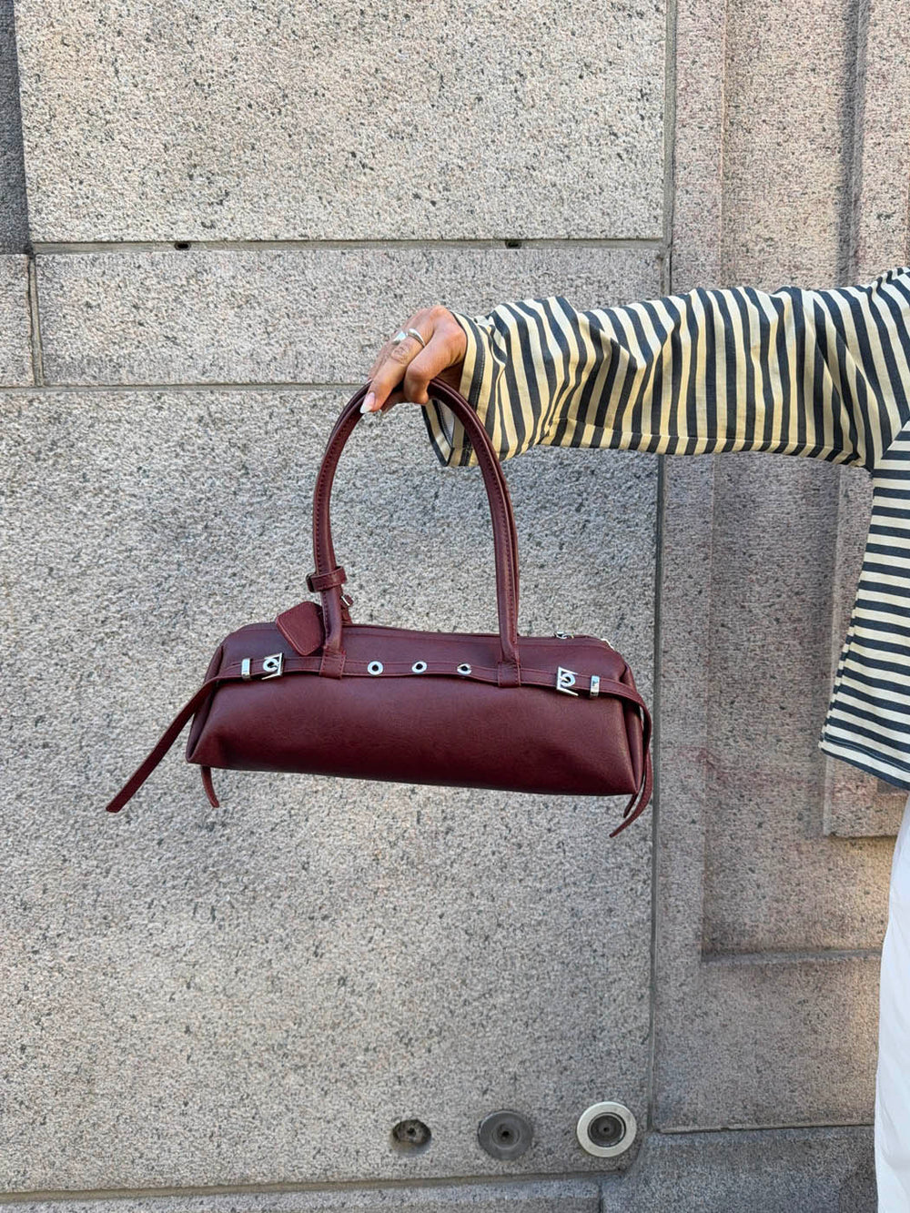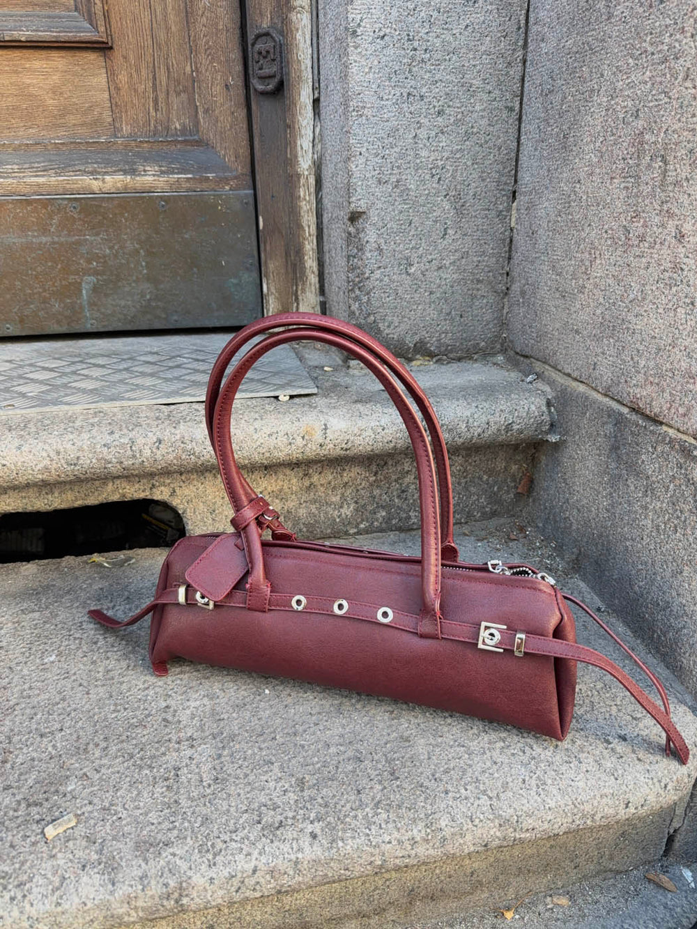 Bobby is a stylish handbag in smooth red faux leather, designed with decorative metal buttons and elegant silver details. The bag has a modern and sophisticated look, making it ideal for both everyday use and more formal occasions. The sturdy handles provide a comfortable grip, while the bag’s unique shape adds a trendy twist. A beautiful accessory that combines functionality and elegance.