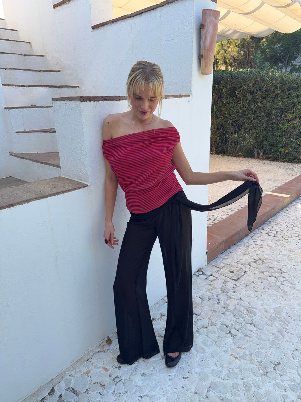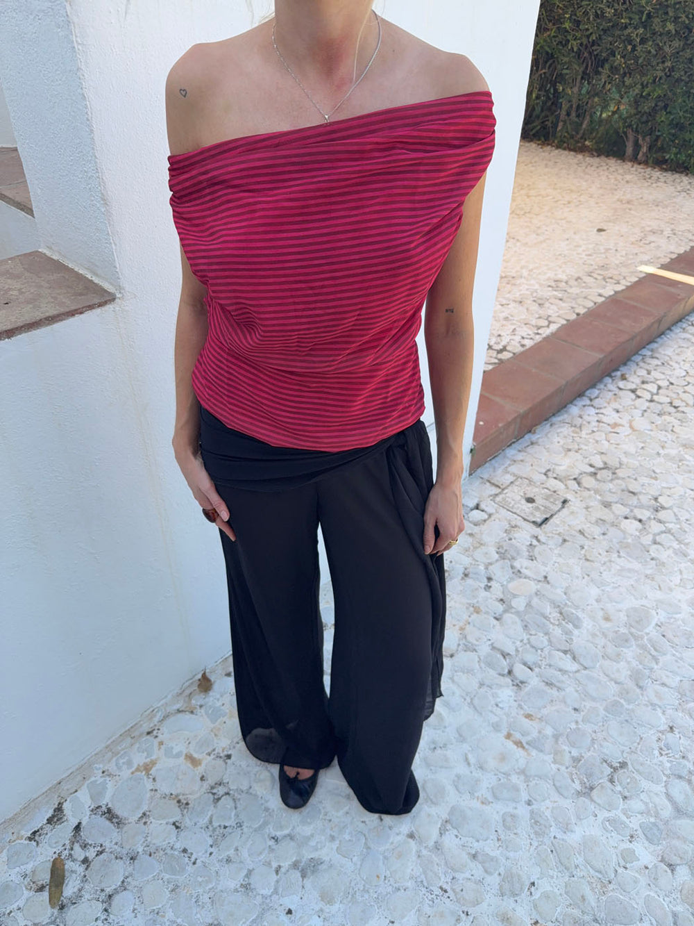 This elegant one-shoulder top in brown with yellow polka dots combines a feminine, flowy look with a flattering fit. It ties at the back, allowing you to adjust the waist and create a beautifully shaped silhouette. Perfect for both everyday wear and festive occasions.