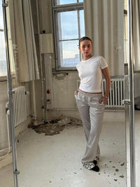 These pants have a low waist and a straight fit. The pants are made of the softest satin material and have an elastic waistband. They have 2 side pockets.