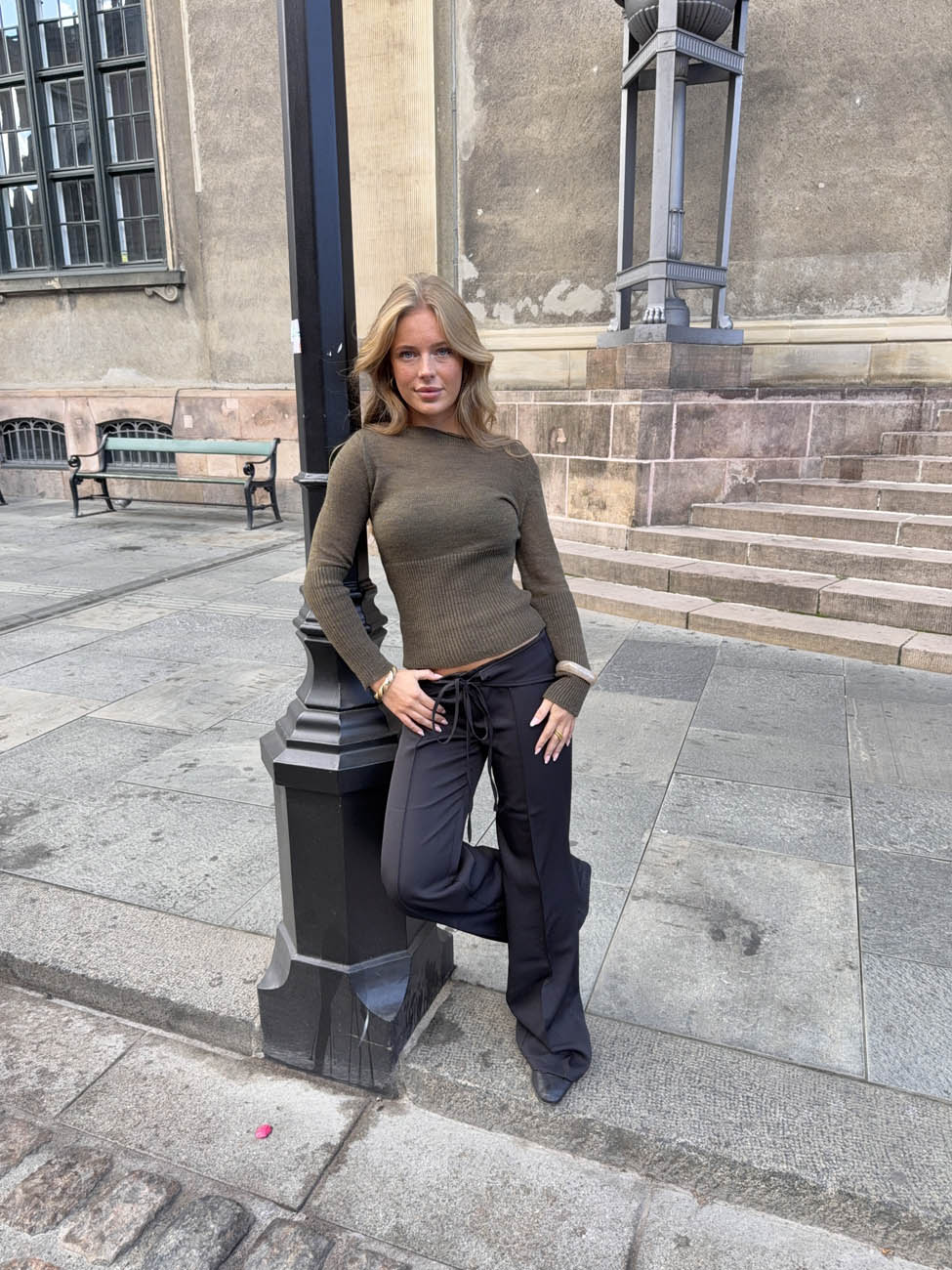 This elegant knitted blouse in a deep brown shade combines comfort and style with a modern cut. The soft knit drapes gently over the body and accentuates the waist with its wide ribbed hem. The blouse features a boat neckline for a sophisticated touch and long, slim sleeves for a timeless and feminine look.