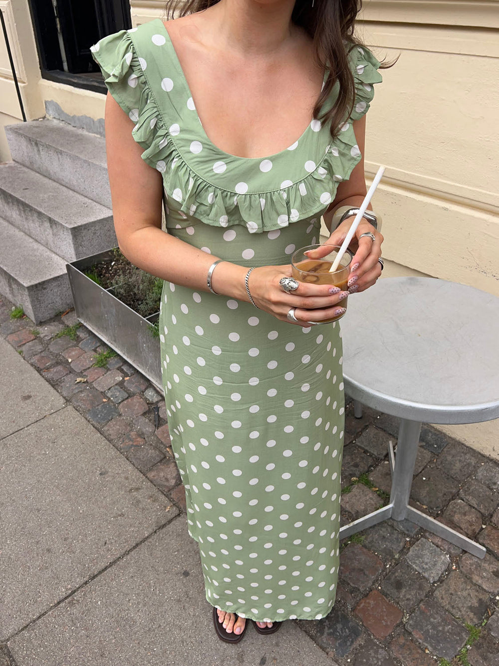 A feminine maxi dress with a timeless polka dot pattern. The design features a flattering fit with delicate gathered details at the shoulders and an elegant open back that adds a modern twist. The subtle side tie bands accentuate the waist and create a beautiful silhouette.