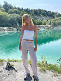 Straight fit striped trousers in light fabric. Has elastic at the waist and pockets on the sides.