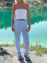 Straight fit striped trousers in light fabric. Has elastic at the waist and pockets at the sides.