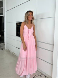 Beautiful long summer dress in comfortable materials. Has smock on the back, v-neck and ties on the front.