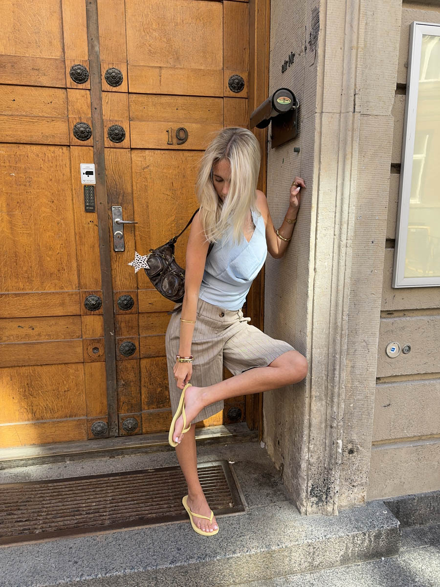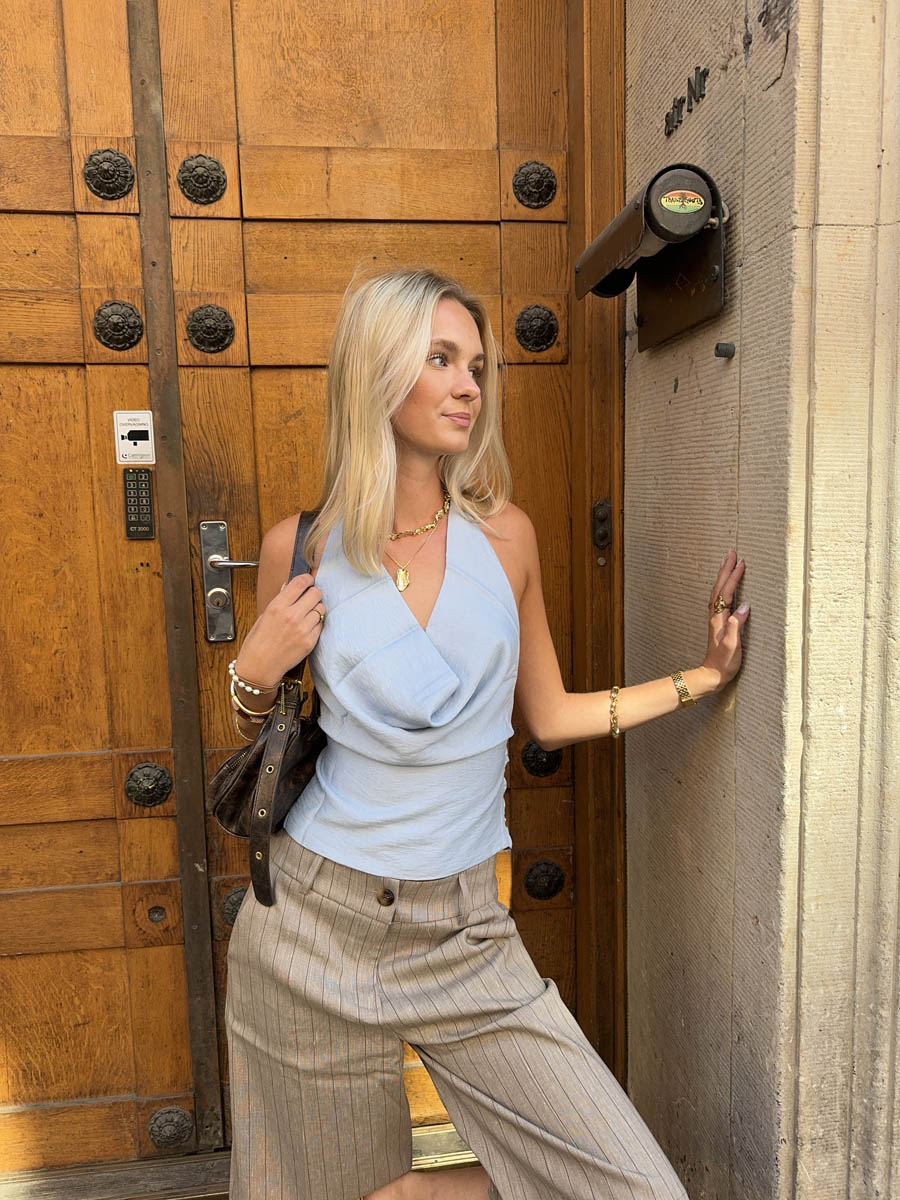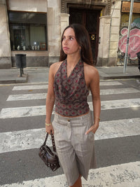This halterneck top combines an eye-catching circle pattern with a flattering, body-hugging fit. The halterneck design leaves the back open for a feminine and airy look. The top is perfect both for everyday wear and as a statement piece for summer events.