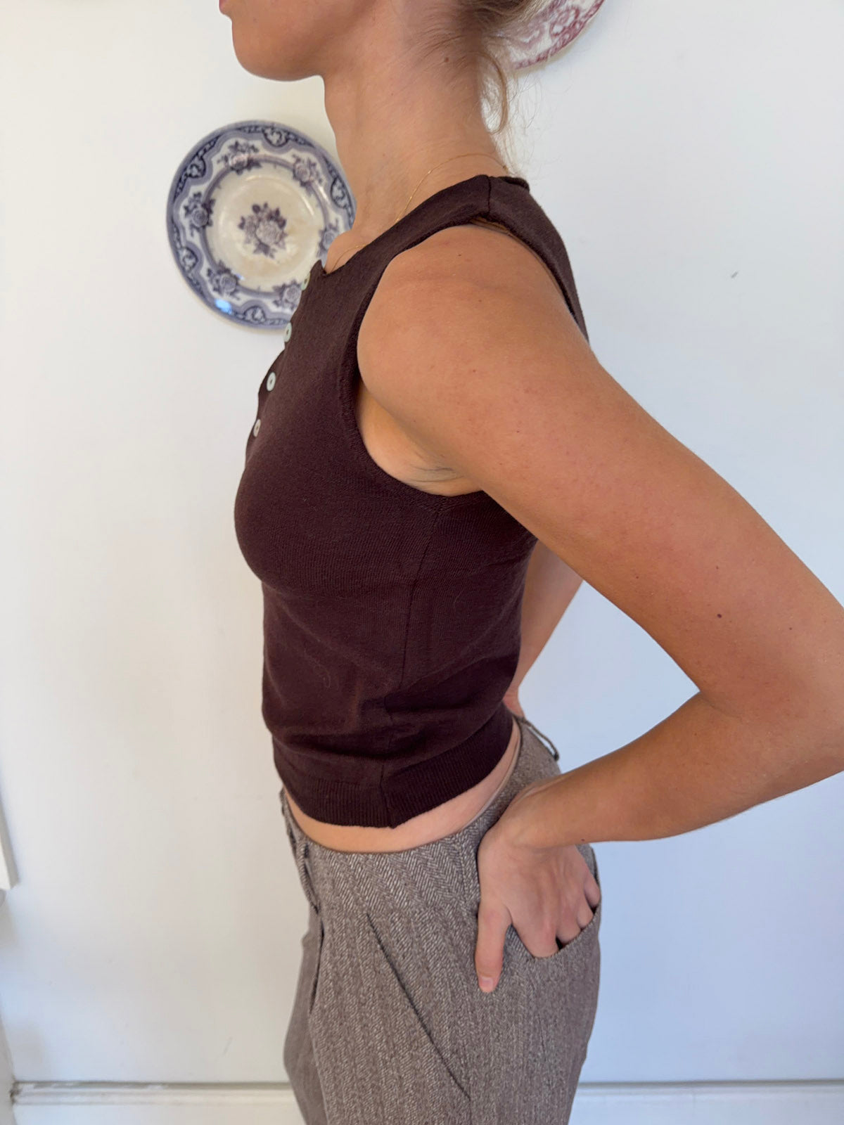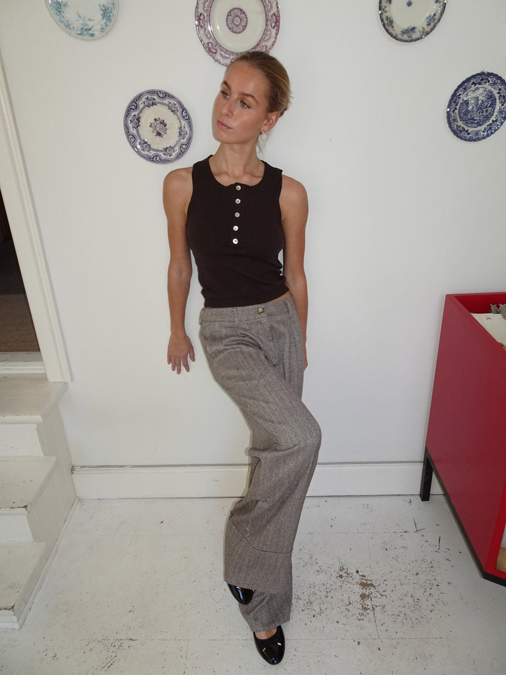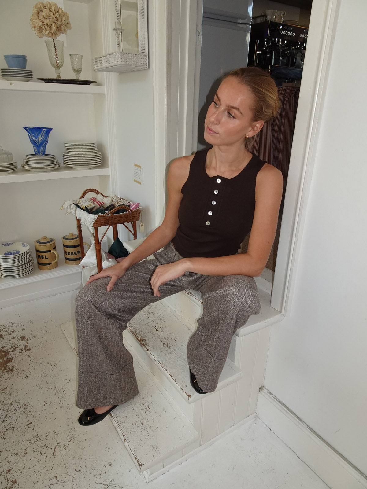 Dilly top is a modern and elegant knitted top that combines simplicity with classic details. It’s made from a soft and lightweight knit quality, making it comfortable to wear both on its own and as part of a layered look. The top features a small collar and front button closure, adding a clean and sophisticated touch. The warm brown color makes it easy to style with both light and dark tones – perfect for everyday wear or the office.