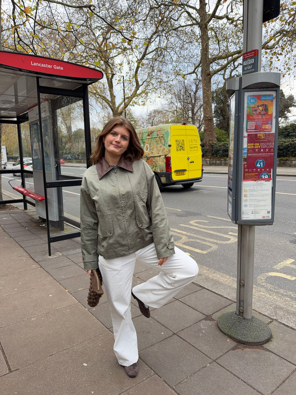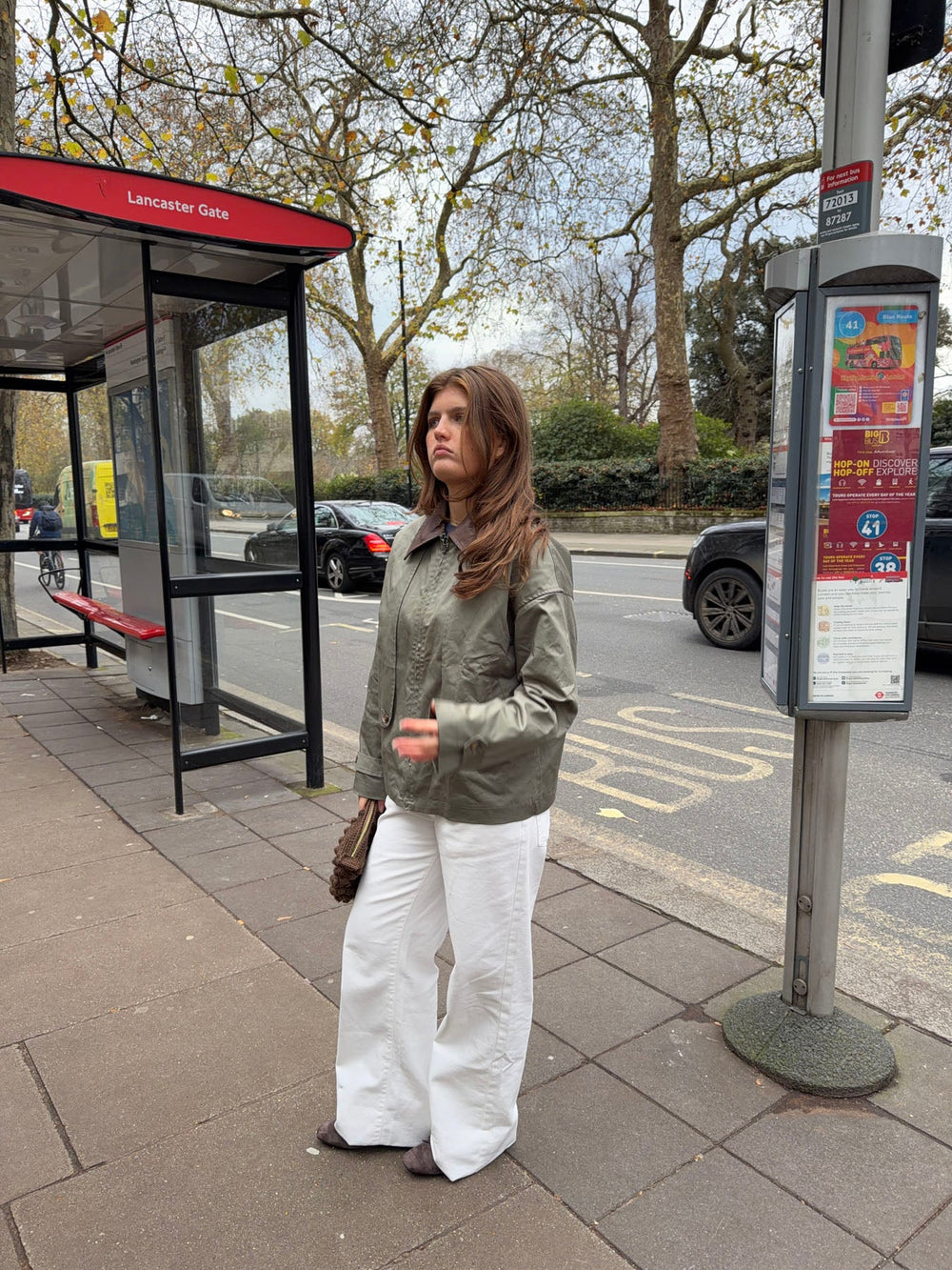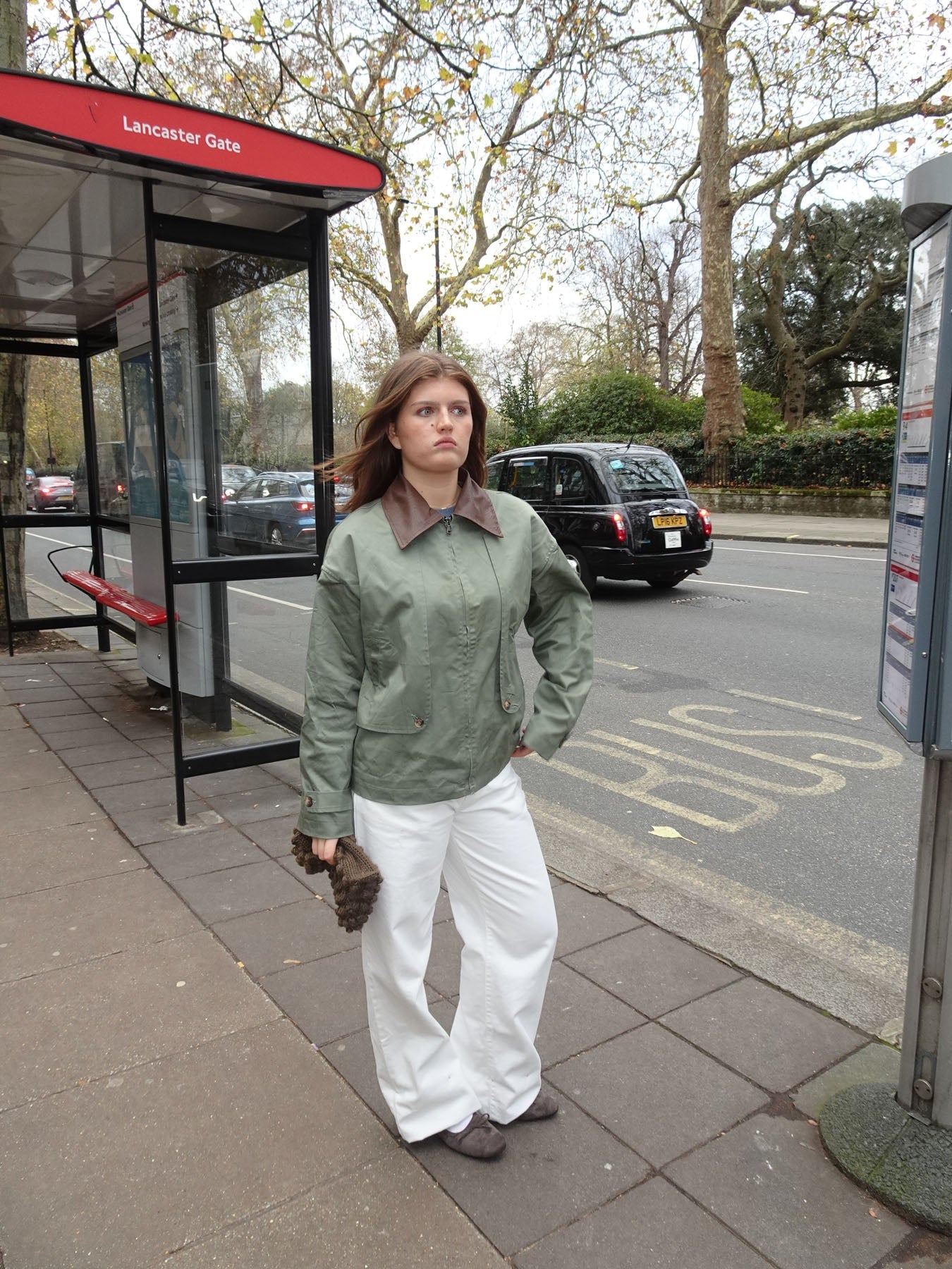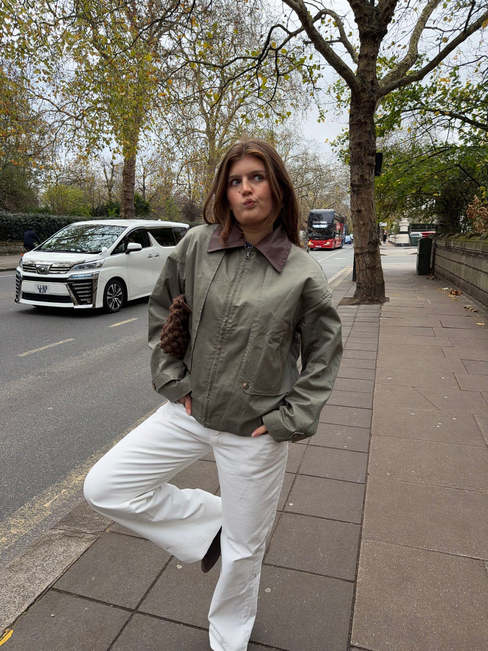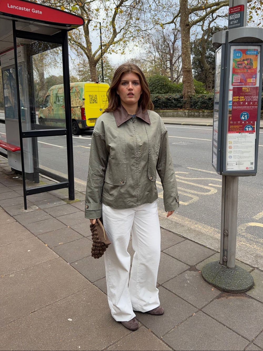 This short transitional jacket combines a countryside-inspired look with classic details, making it both timeless and modern. Crafted in a beautiful olive-green shade, it features a striking brown leather-look collar that adds an exclusive and eye-catching contrast.