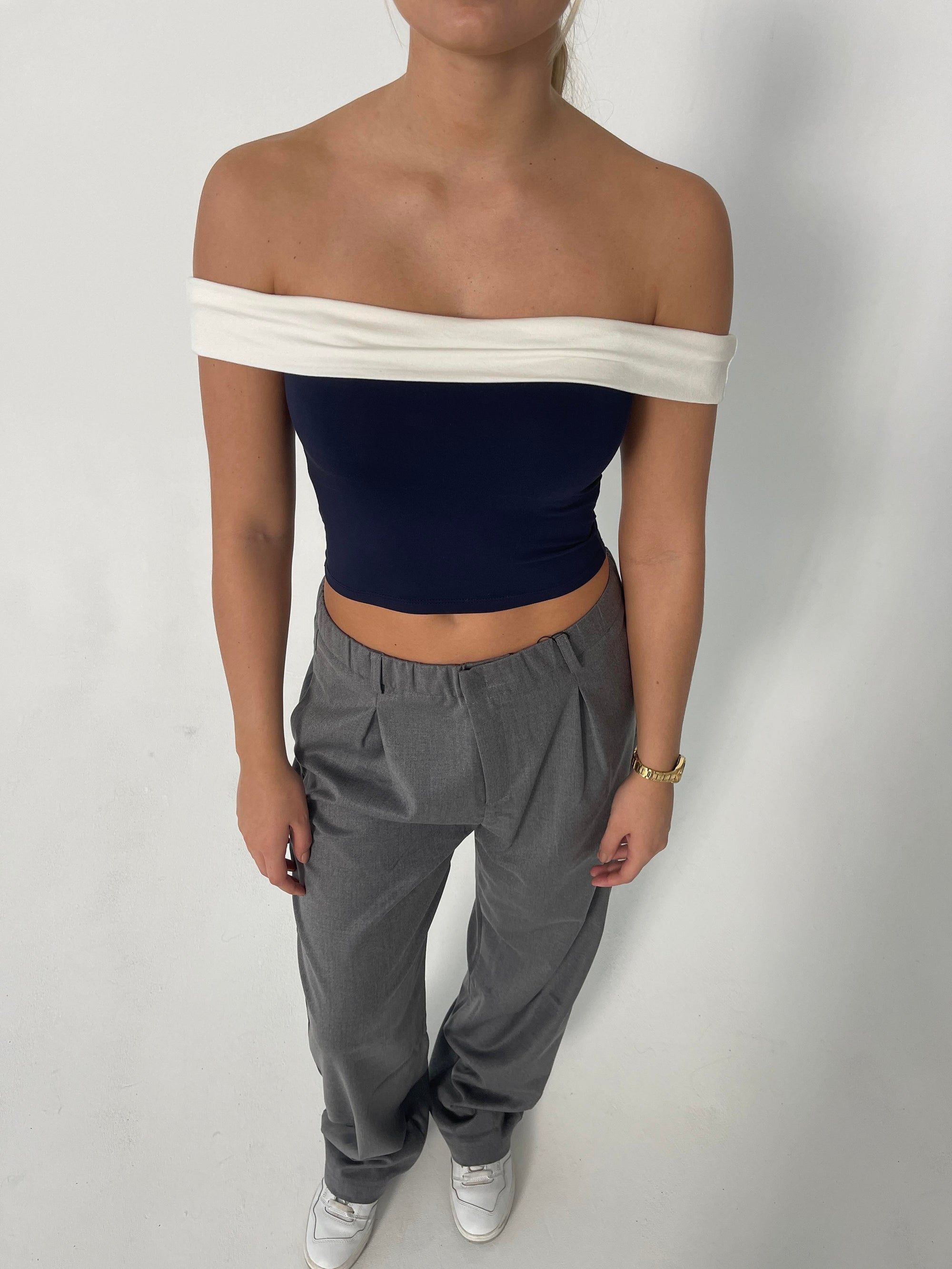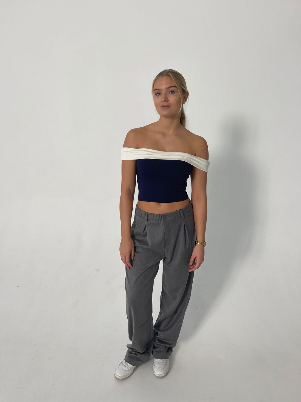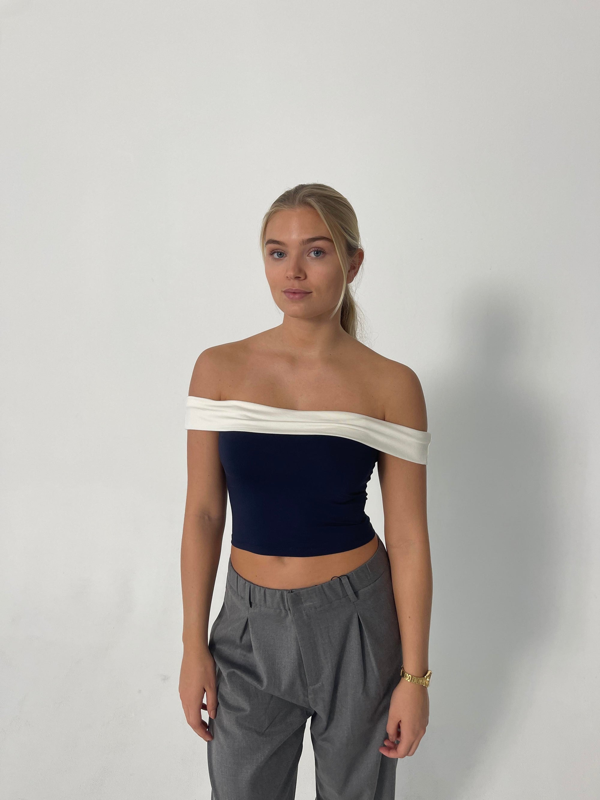 Tight-fitting off shoulder tube top with the finest white ribbon detail.