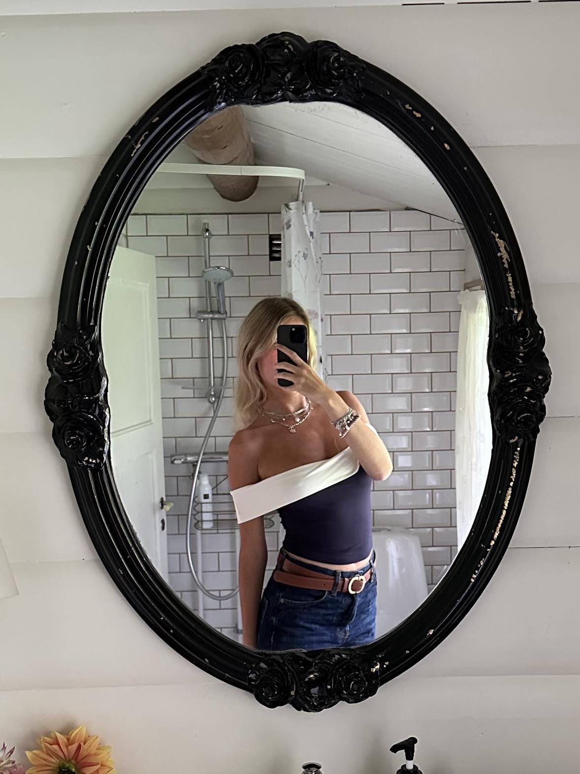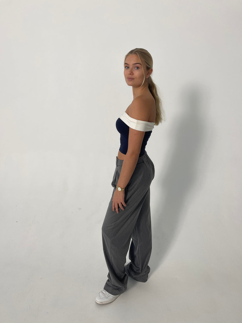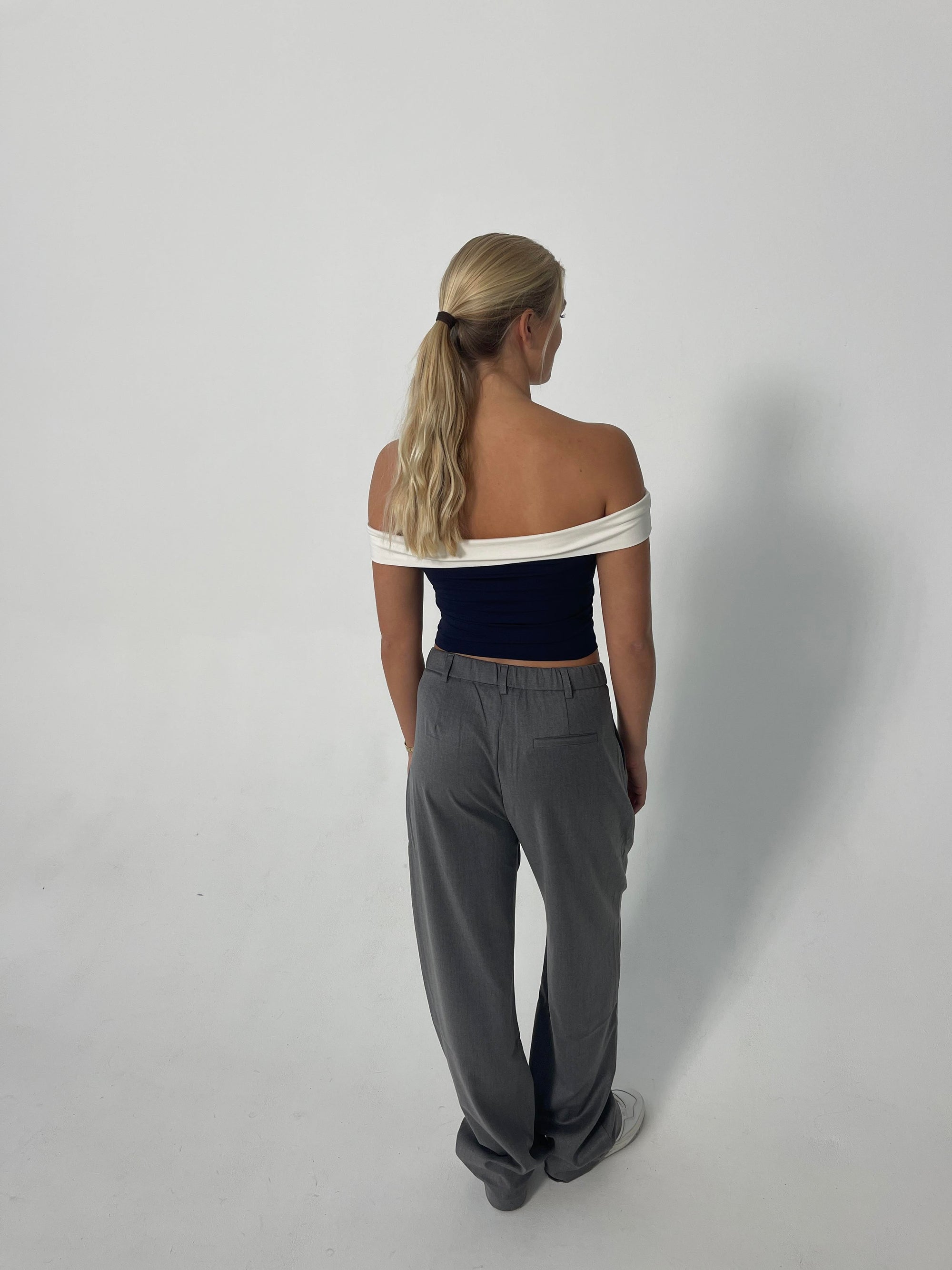 Tight-fitting off shoulder tube top with the finest white ribbon detail.