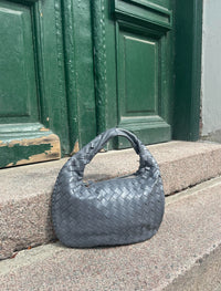Our Paris shoulder bag has a round shape and a woven/braided design. The bag has a large main compartment with zip closure, and two smaller compartments with zips inside the bag and a small open pocket.