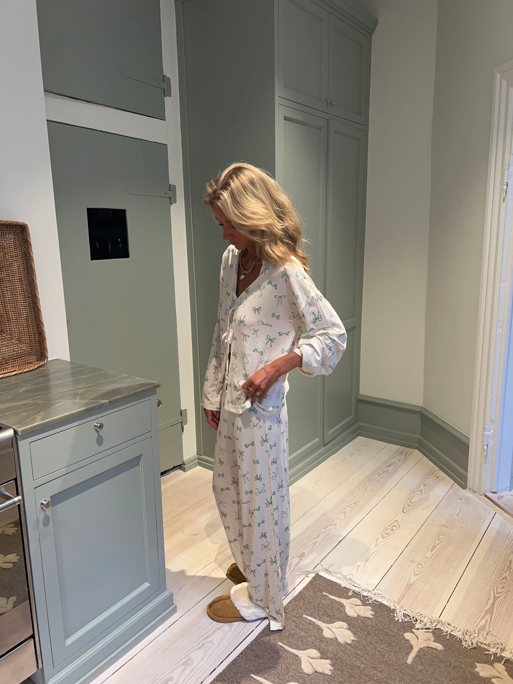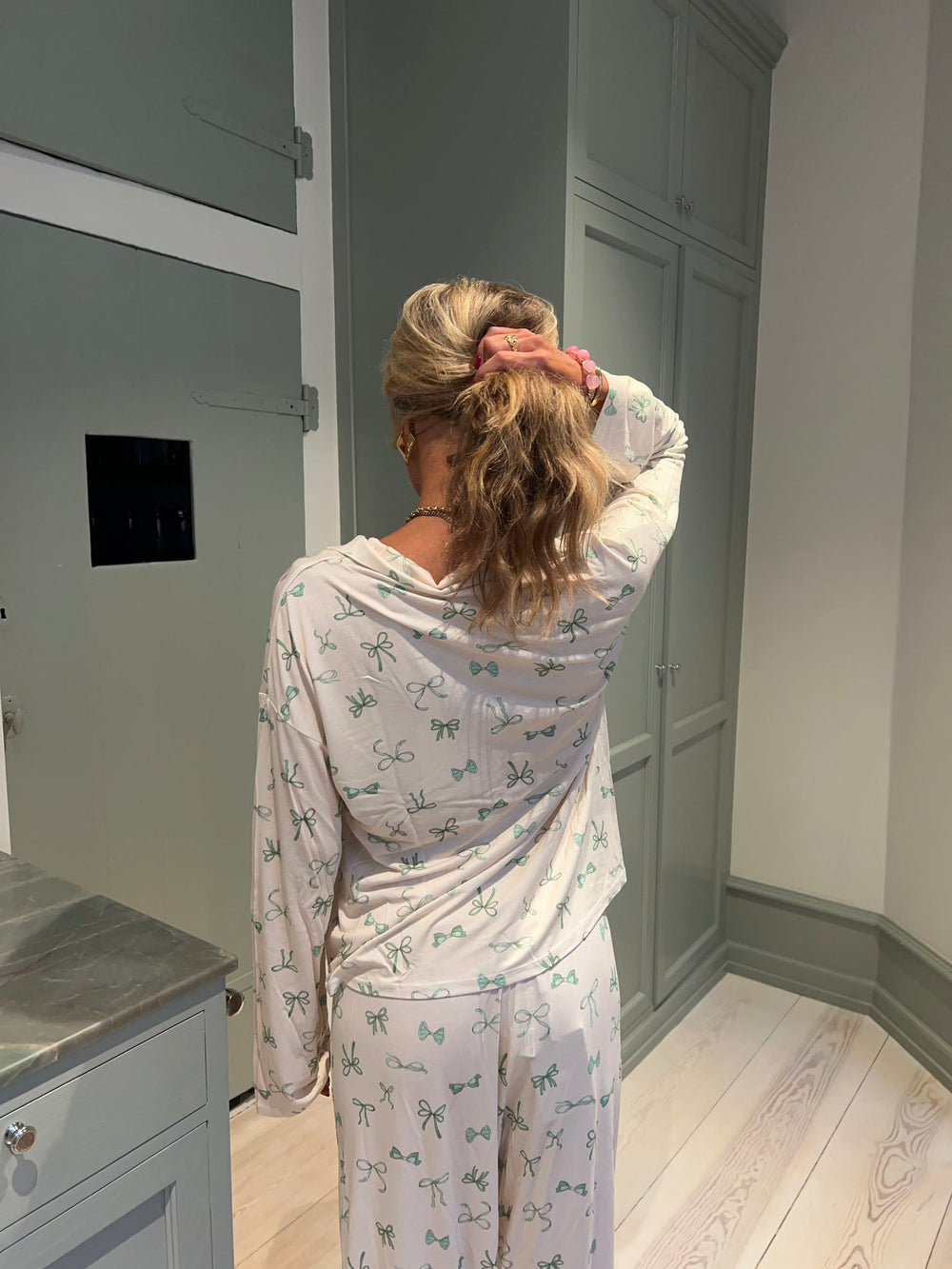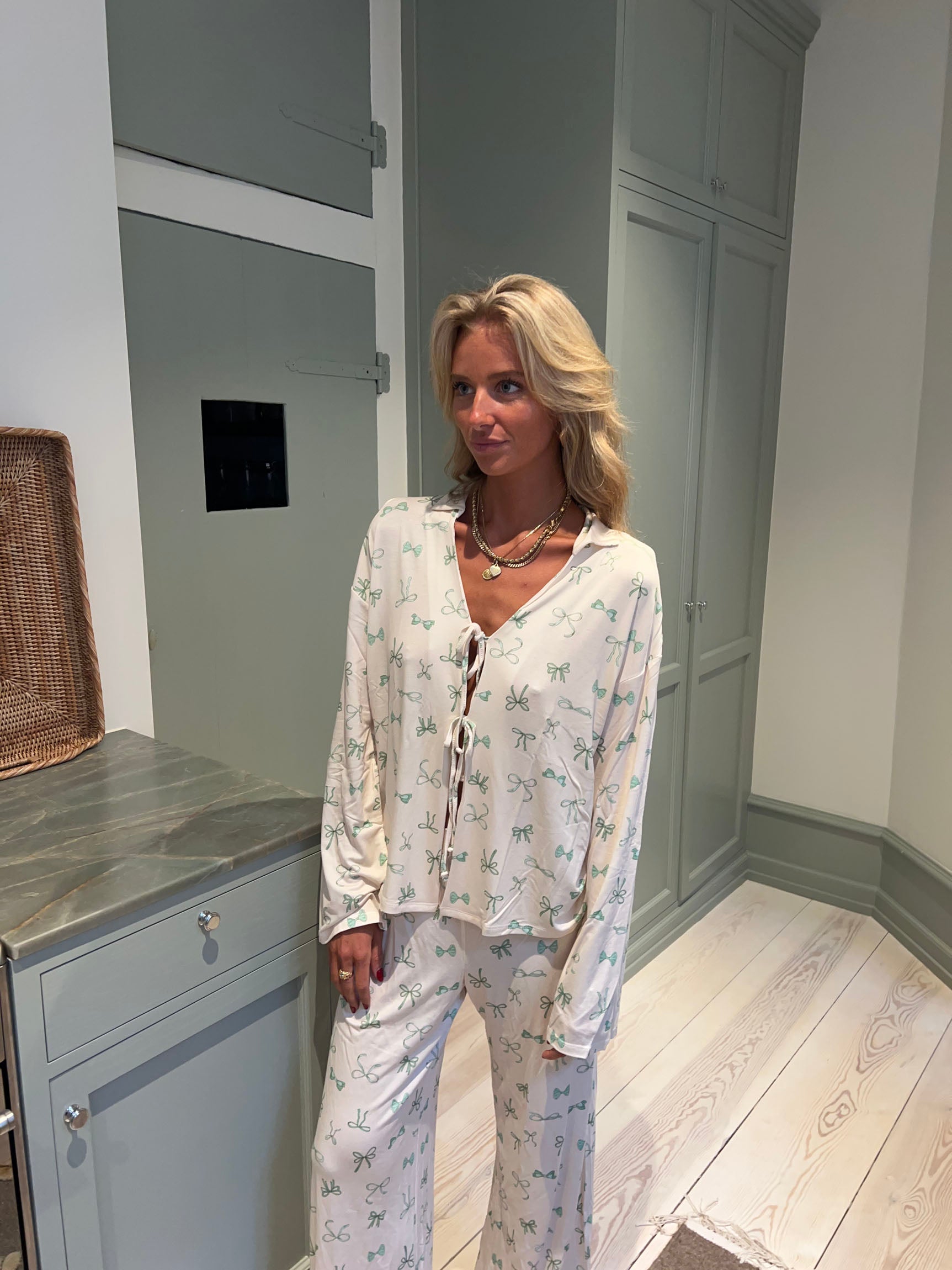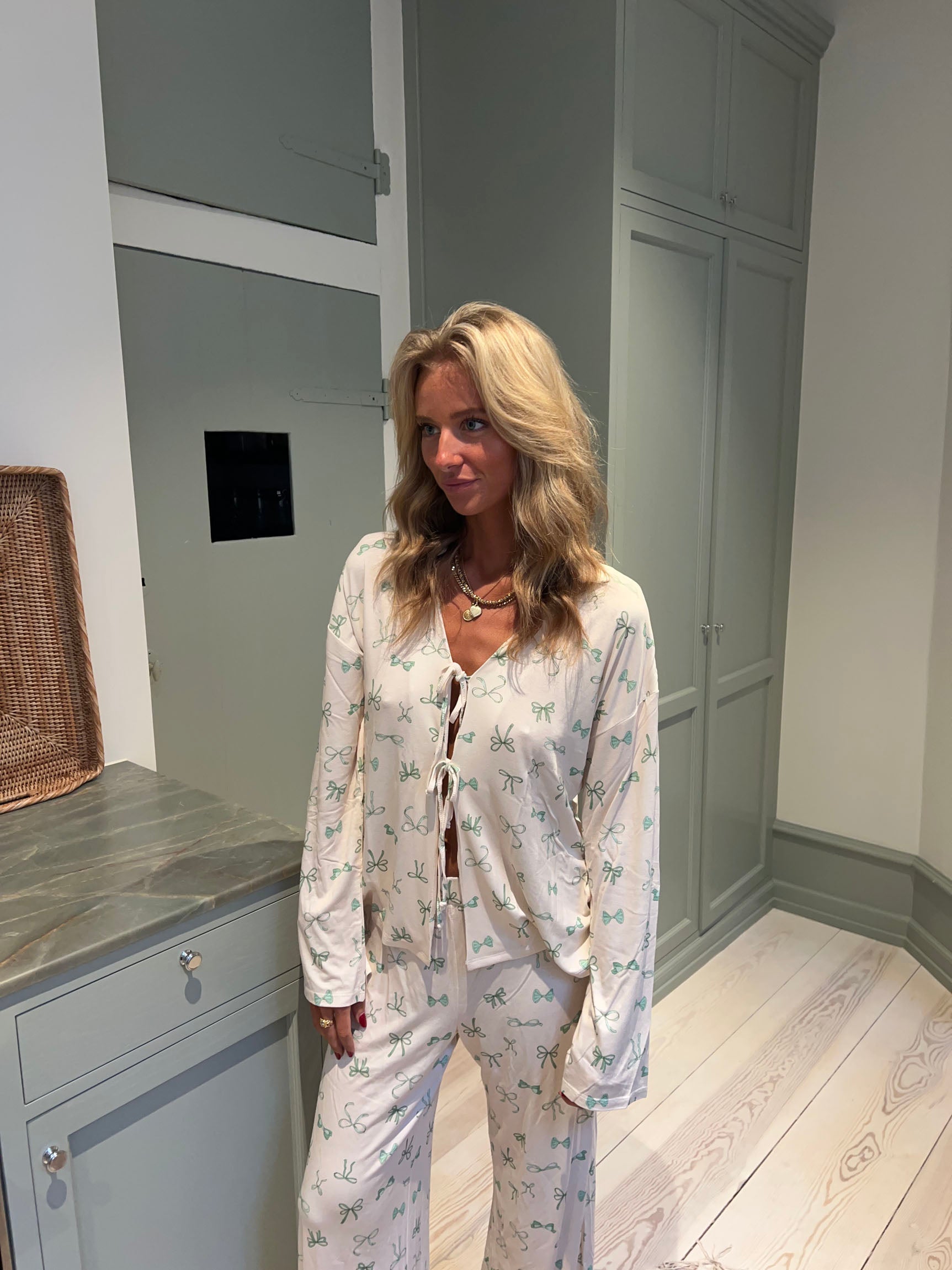 This off-white pyjamas blouse is both cute and comfortable, ideal for the cooler seasons. It features green bows that add a playful and feminine touch. With its loose fit and super-soft material, it feels wonderful against the skin, and it ties at the front for a relaxed and stylish fit. The blouse pairs perfectly with the matching "Linnea pyjama pants with bows - off white," creating a complete and cozy pyjama look.