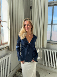 The most beautiful satin blouse with long and wide sleeves and a loose fit. The blouse has tie details at the front and a v-neckline.