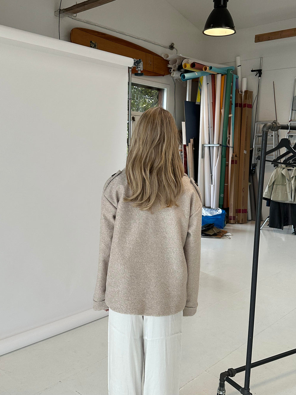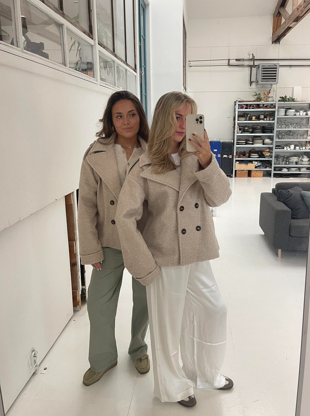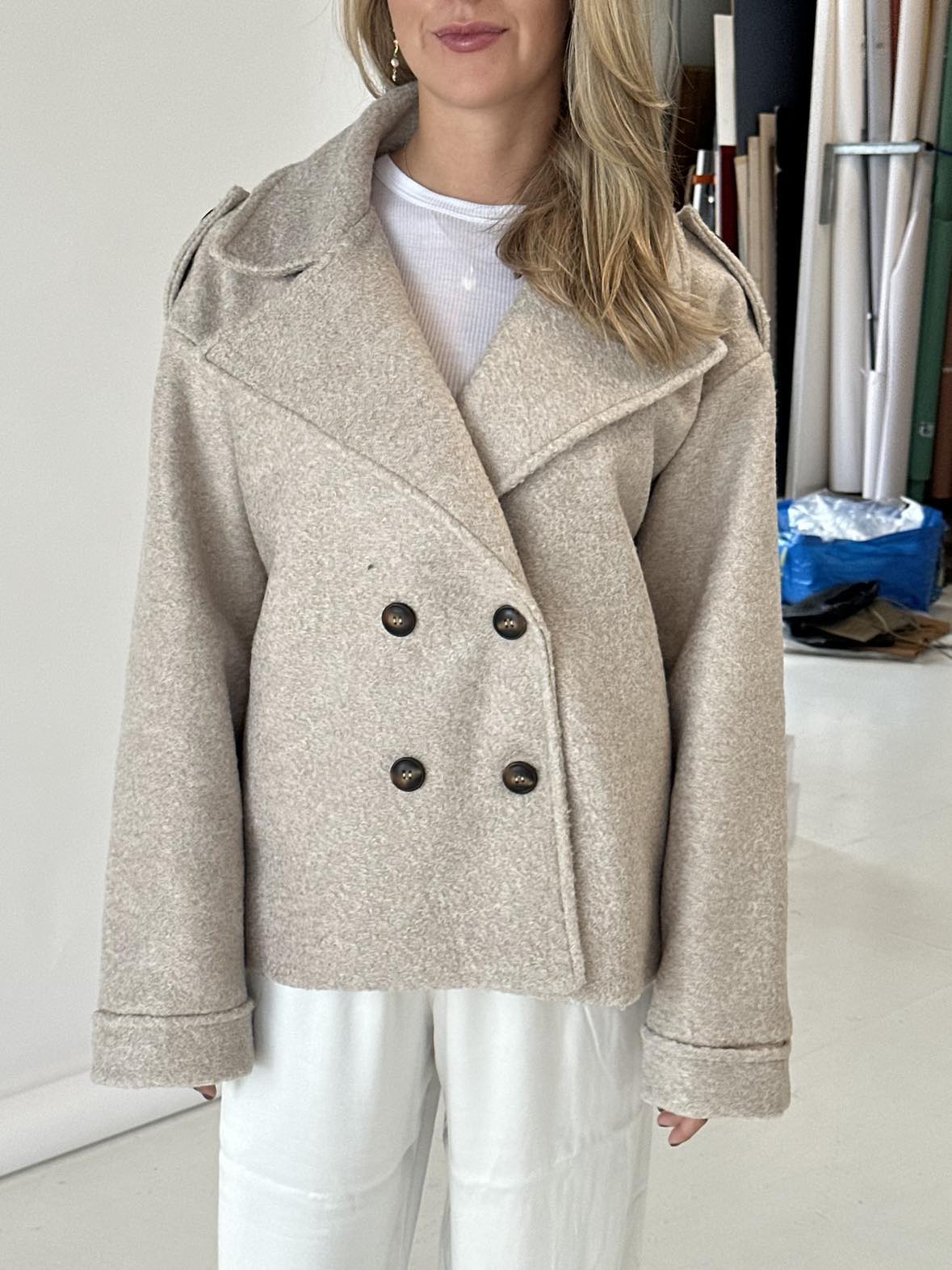 This coat has a short and loose fit. The jacket has wide lapels and 2 large side pockets. It closes with a double button closure at the front and a buttoned shoulder detail.