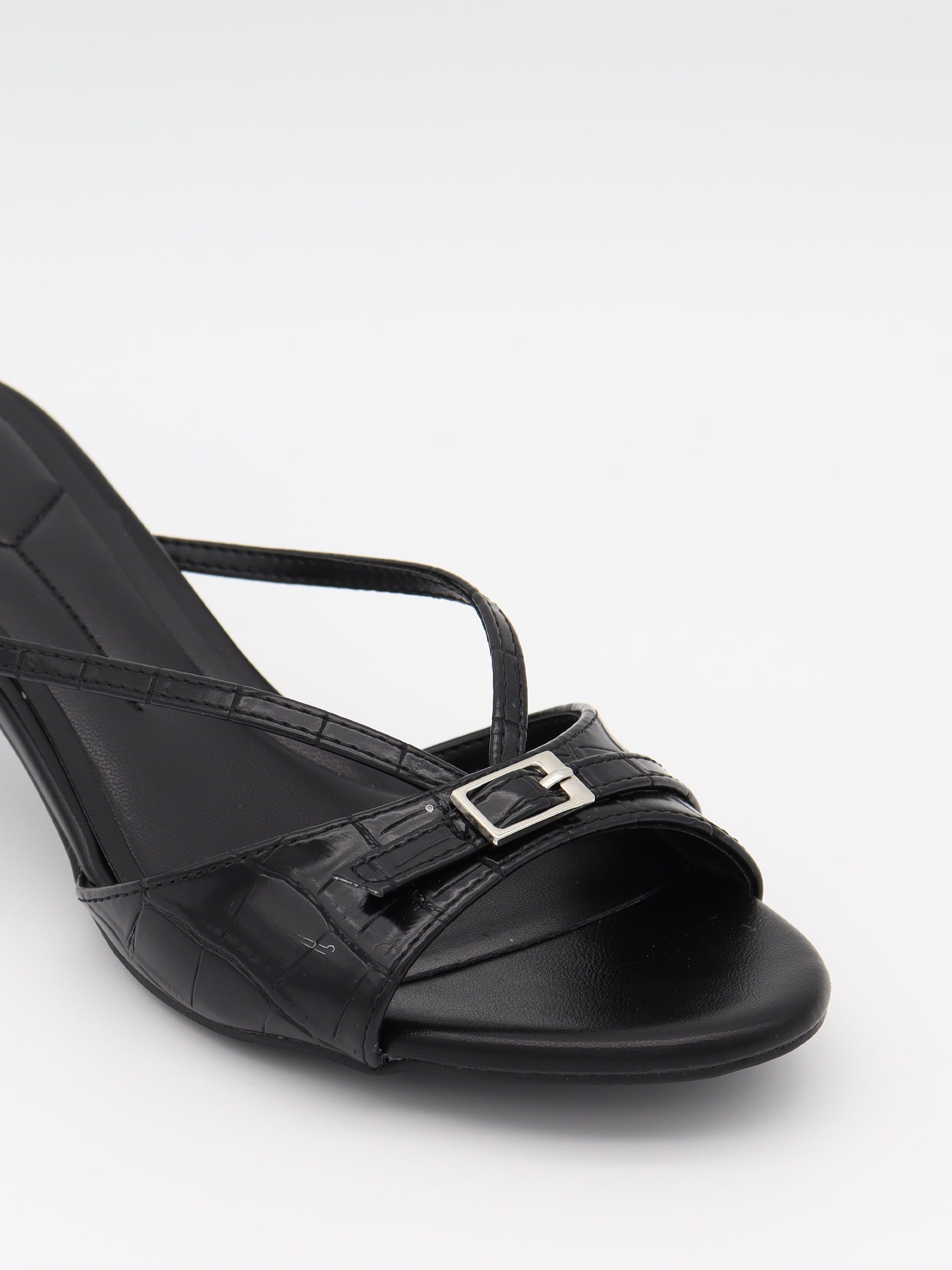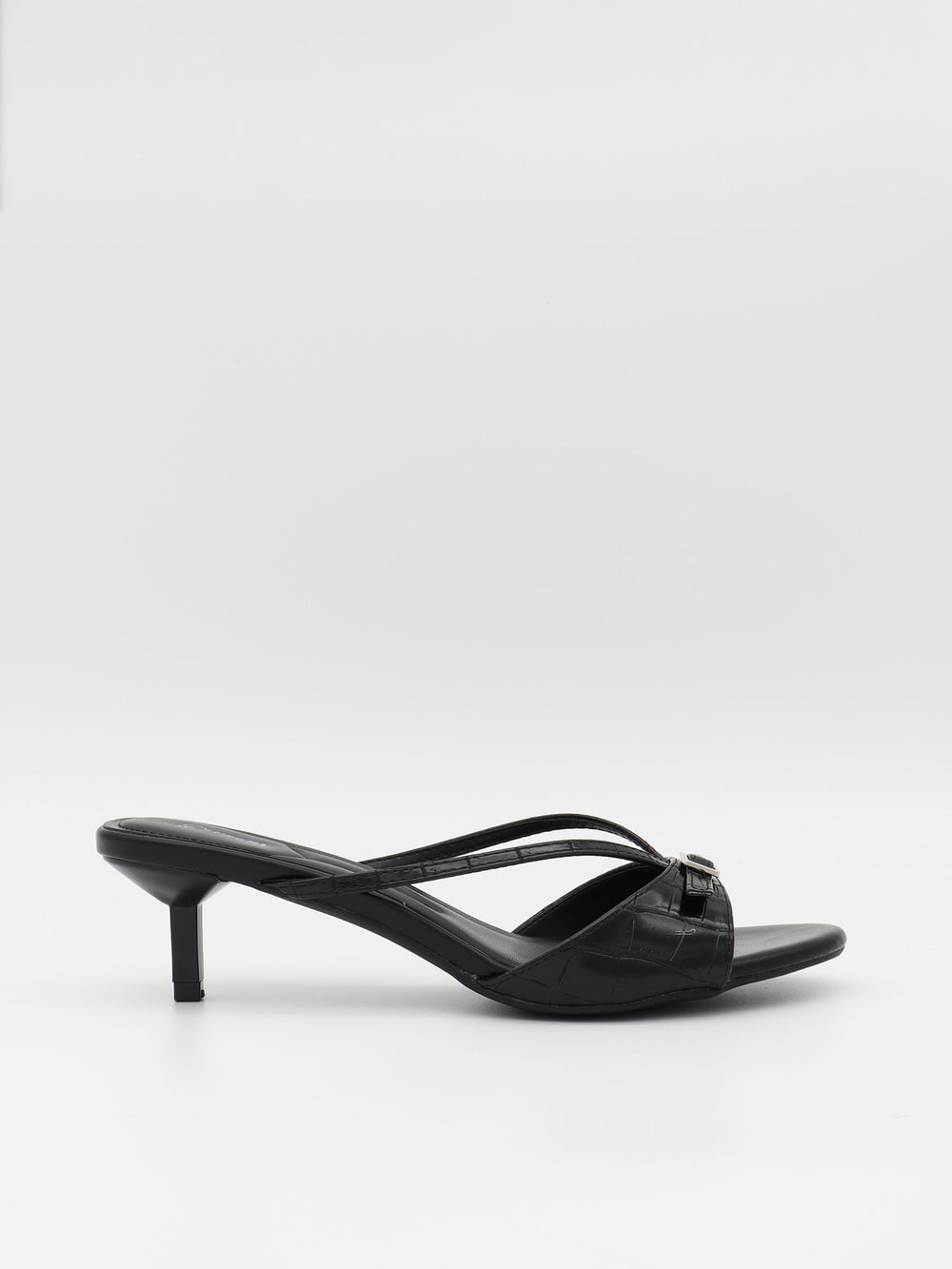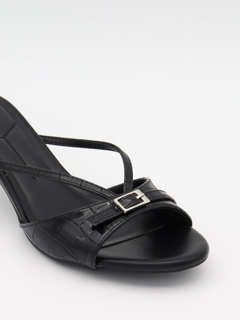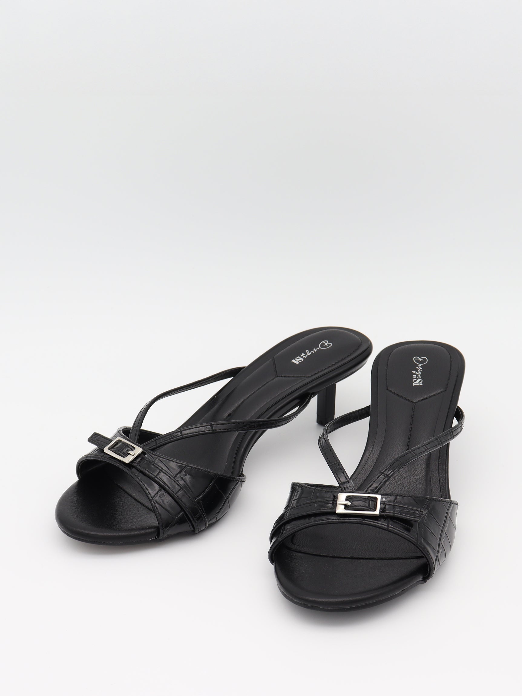 These elegant black heeled sandals are the perfect choice for anyone who loves a minimalist yet refined look. The delicate, slim straps cross over the foot to create a feminine expression, while the small silver buckle detail adds a subtle touch of glamour.