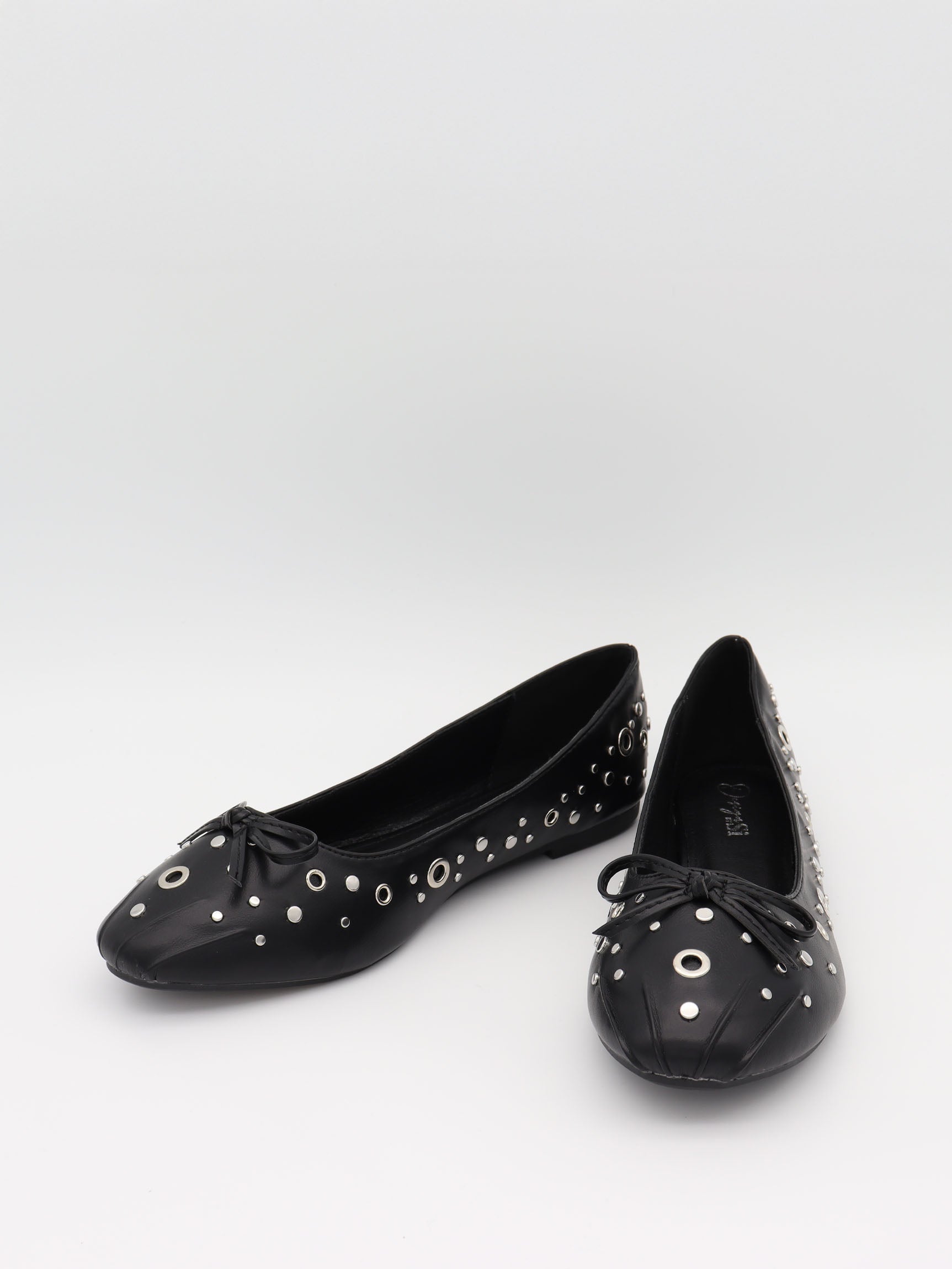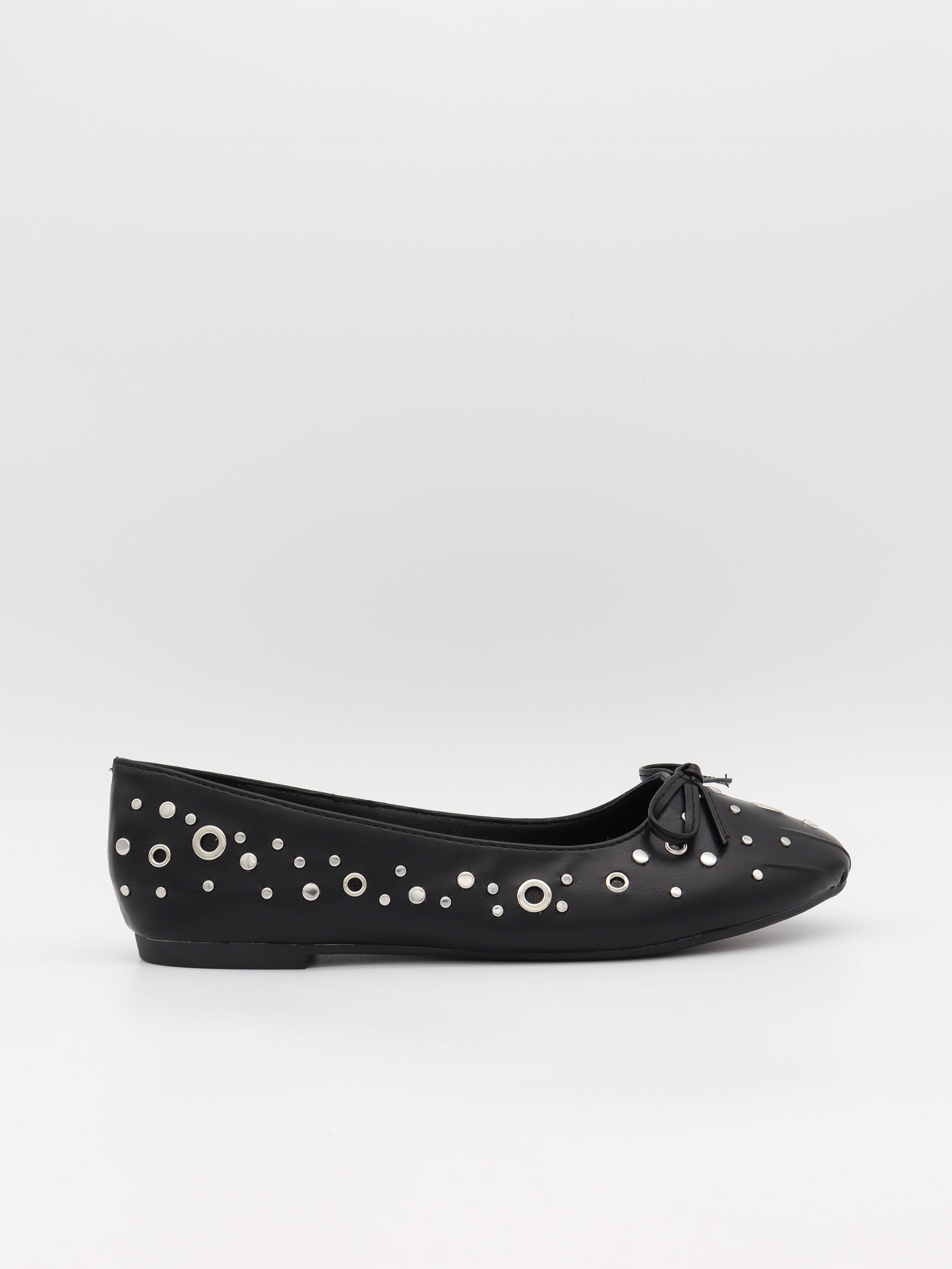 These black ballerinas combine classic femininity with a modern edge. The small metal studs and ring details give the shoes a bold yet stylish look that contrasts beautifully with their timeless silhouette. The delicate bow on the toe adds an elegant touch, while the soft fit ensures comfort throughout the day. Perfect for balancing feminine and cool elements – whether paired with jeans, skirts, or dresses. A versatile pair of shoes that elevate any outfit with a subtle yet striking twist.