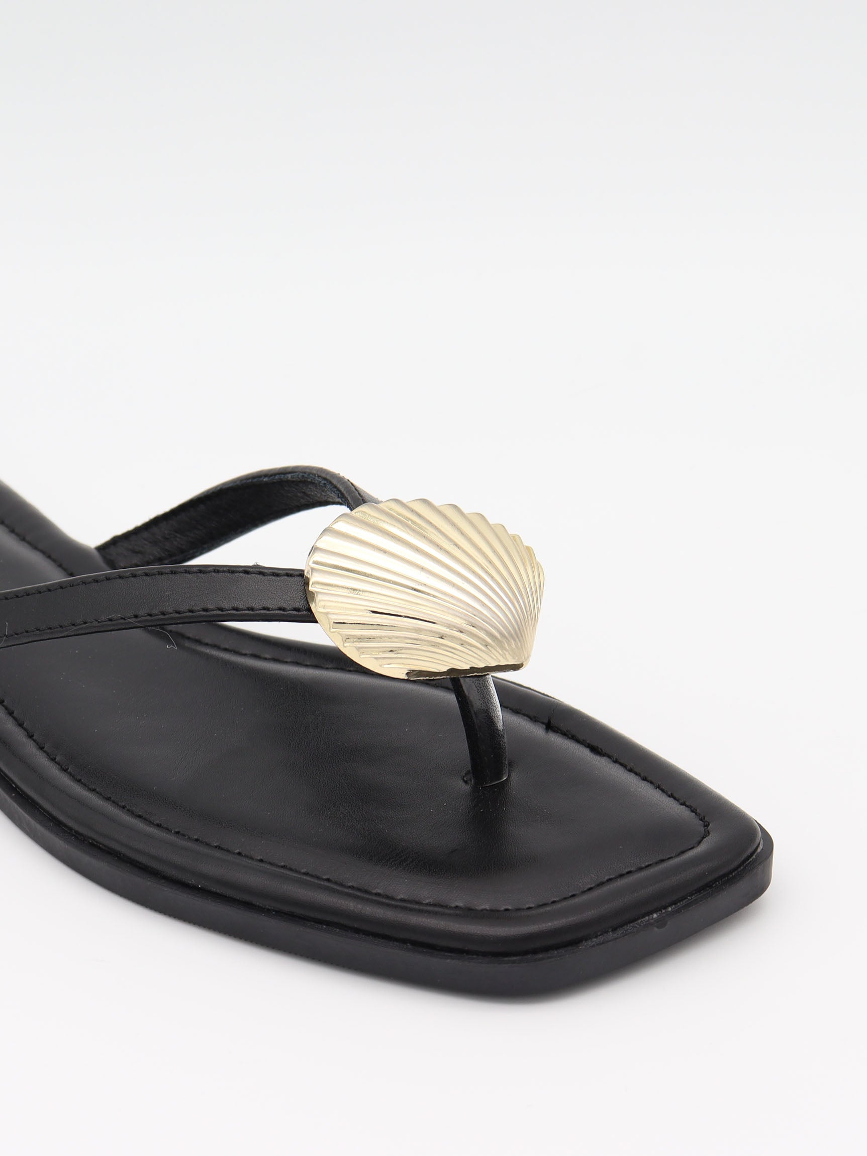 These sandals combine a minimalist design with an exclusive twist. The smooth black surface is elevated by the decorative gold-toned shell, creating an elegant and modern look. The square toe adds a trendy touch, while the slim straps and flat sole ensure comfortable wear all day long. Perfect for summer outings, vacations, and everyday looks where you want a simple yet eye-catching accessory.