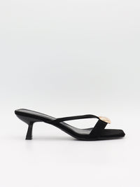 These elegant mules combine a minimalist design with an exclusive twist. The slim straps create a light and feminine look, while the large gold-toned detail at the front gives the sandals a sophisticated and eye-catching finish. The square toe adds a modern touch, and the slender heel provides a beautiful silhouette without compromising comfort. Perfect for parties, dinners, and special occasions where you want a stylish and luxurious look.