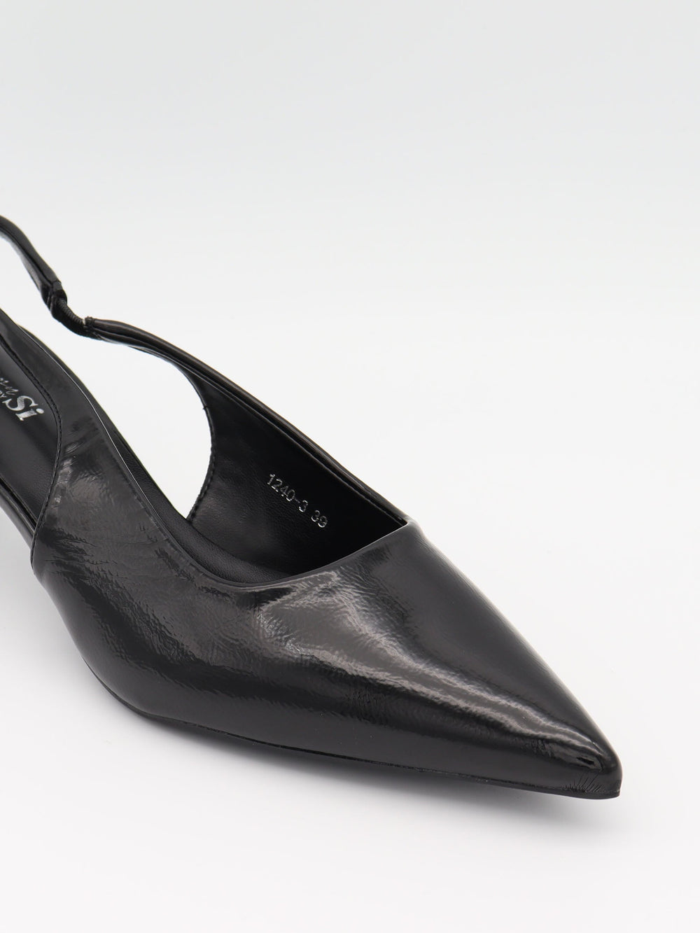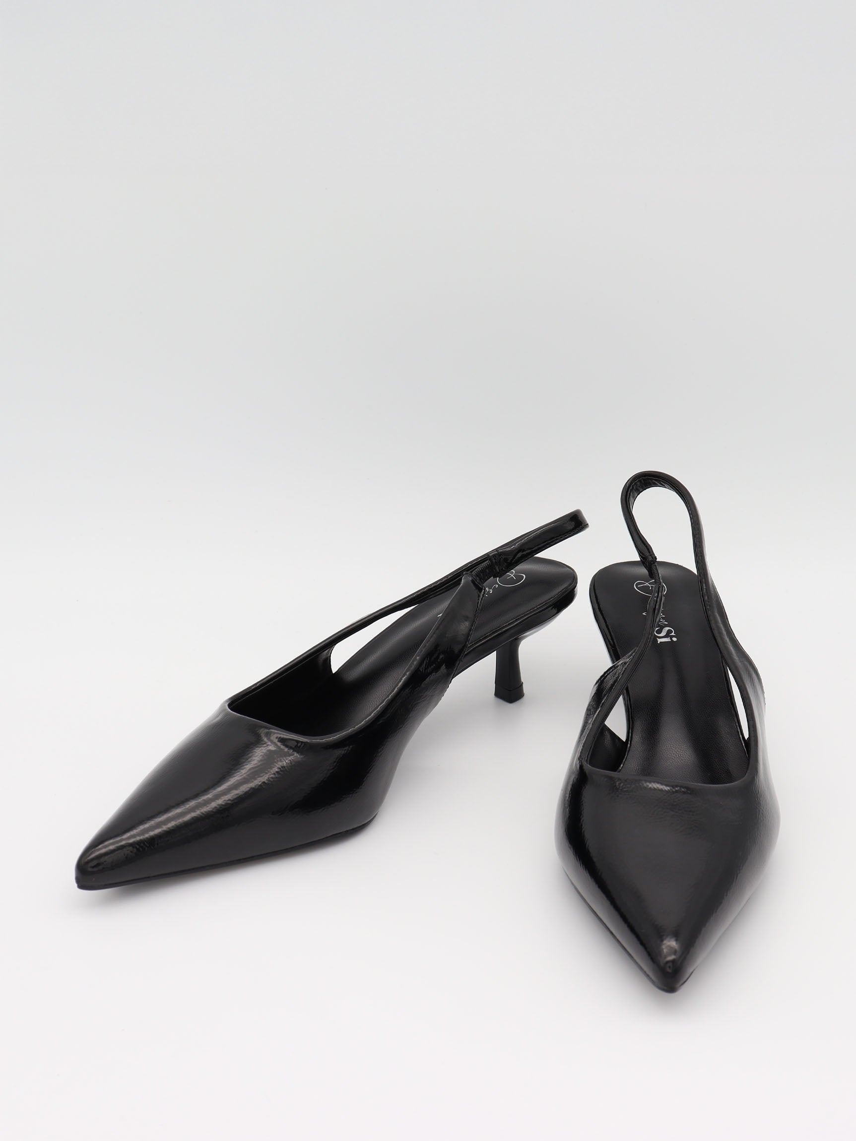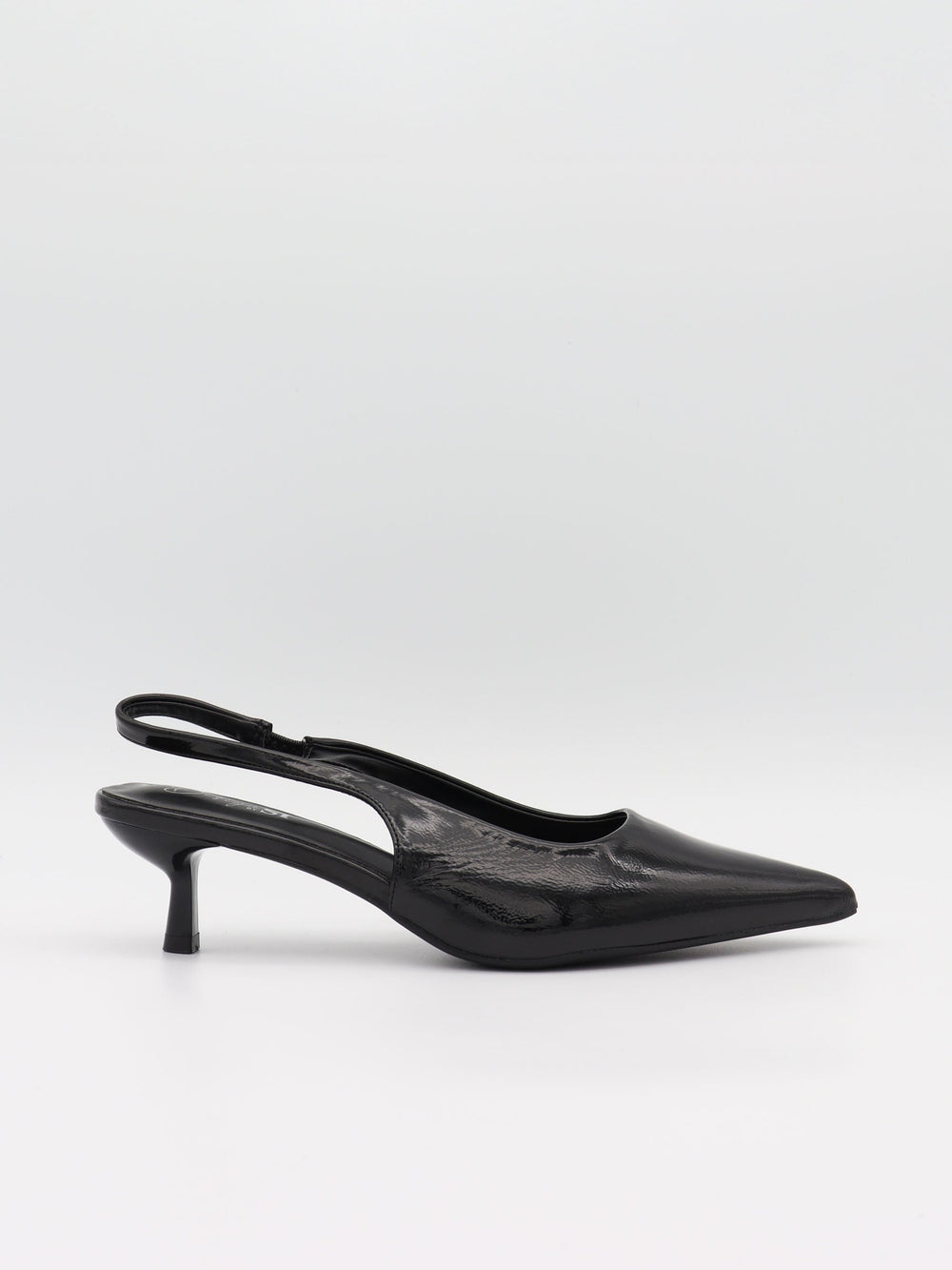 These elegant slingbacks combine sophisticated minimalism with a modern, polished expression. The glossy finish gives the shoes a luxurious look, while the pointed toe creates a sharp and feminine silhouette. The slim heel adds elegance without compromising comfort, and the open slingback strap ensures a light and airy fit. Perfect for everything from office and evening looks to special occasions where you want a simple yet exclusive design.