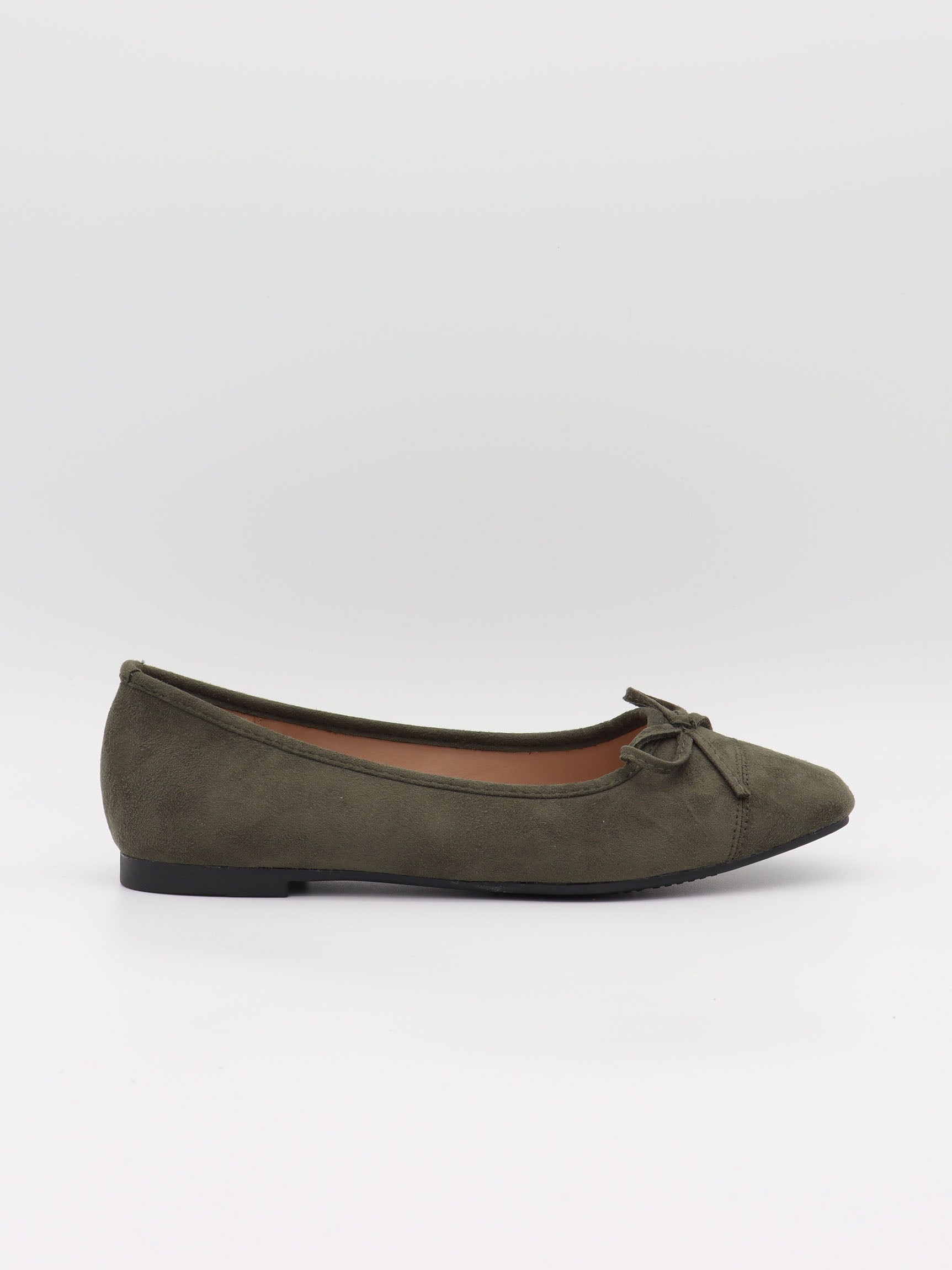 These delicate ballerinas feature a classic and feminine design with a soft suede material in a muted olive-green shade. The pointed toe and small decorative bow at the front give the shoe an elegant and light expression, making it easy to style for both everyday wear and more dressed-up occasions. The flat sole ensures all-day comfort, while the simple design makes the shoe a versatile addition to your wardrobe.
