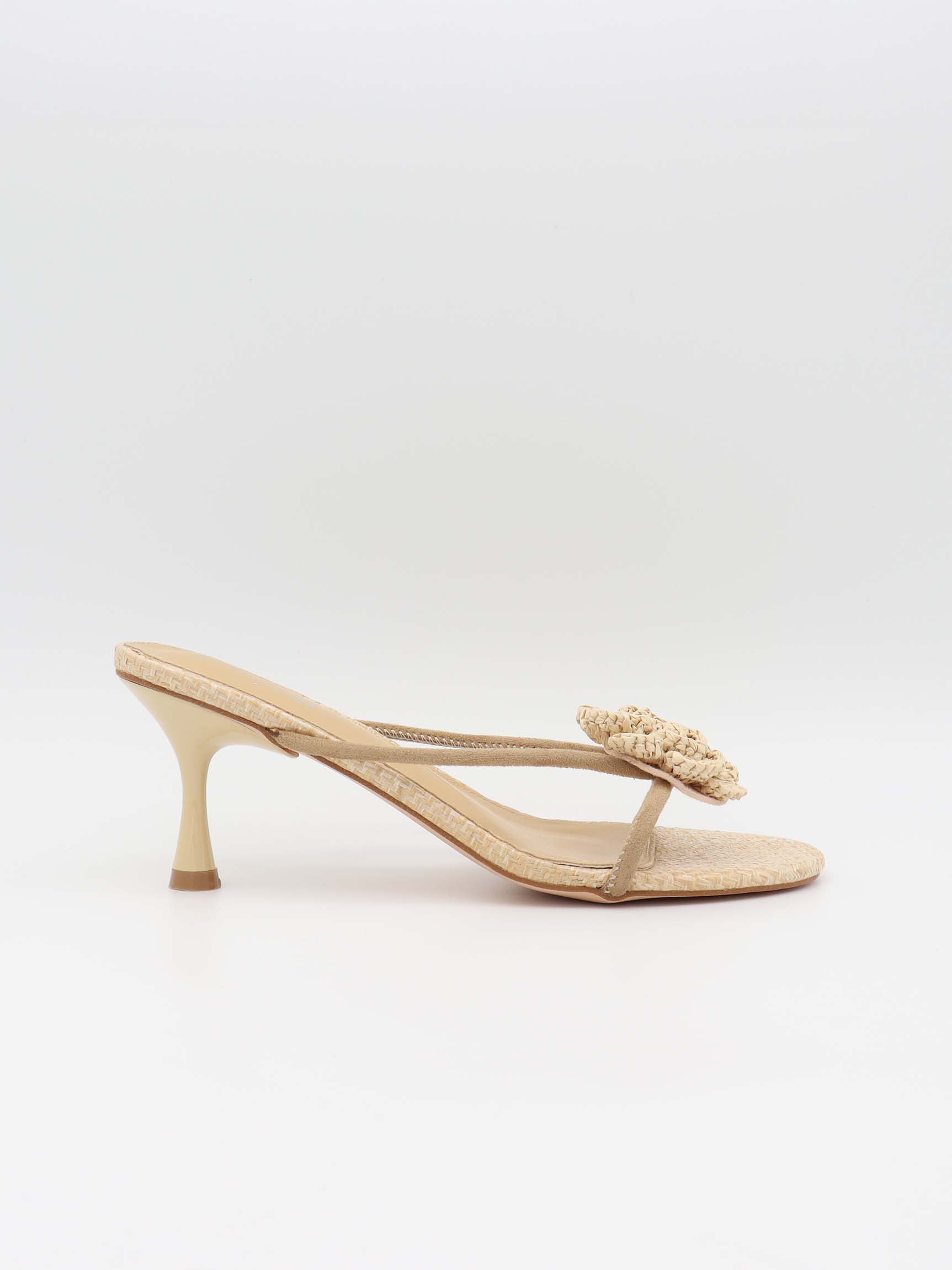 These feminine heels exude summery elegance with their natural braided texture and decorative flower detail at the front. The soft beige tone adds a light and refined expression, while the slim heel provides a stylish lift without feeling overpowering. The delicate, thin straps create an airy design, making the heels perfect for warm days and festive occasions.