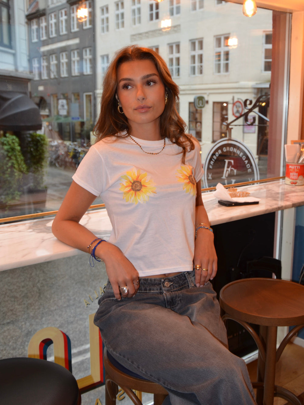 Baby tee with sunflowers on it. Our tees are from Fruit of the Loom and made from super soft and comfortable quality.