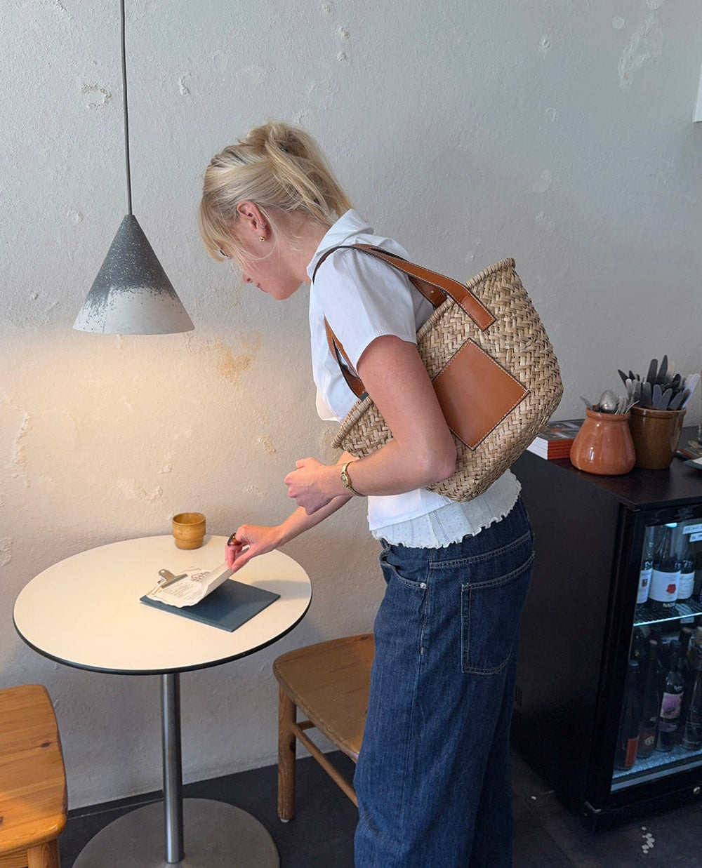 The perfect bag for a beach day or everyday use. The bag is made of a woven material and is very spacious. It features brown straps that can easily be worn over the shoulder.