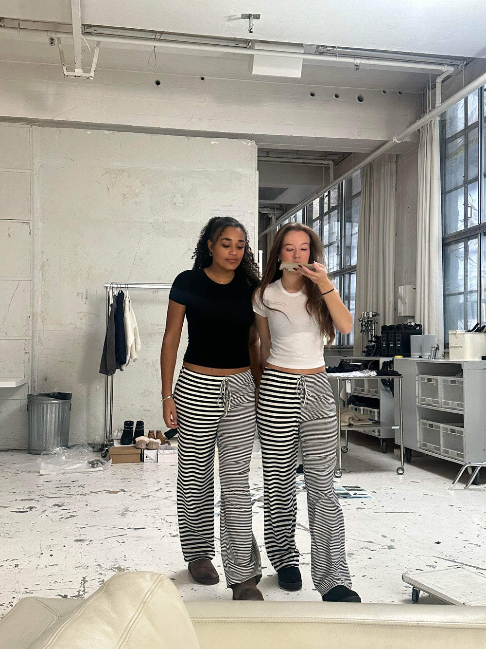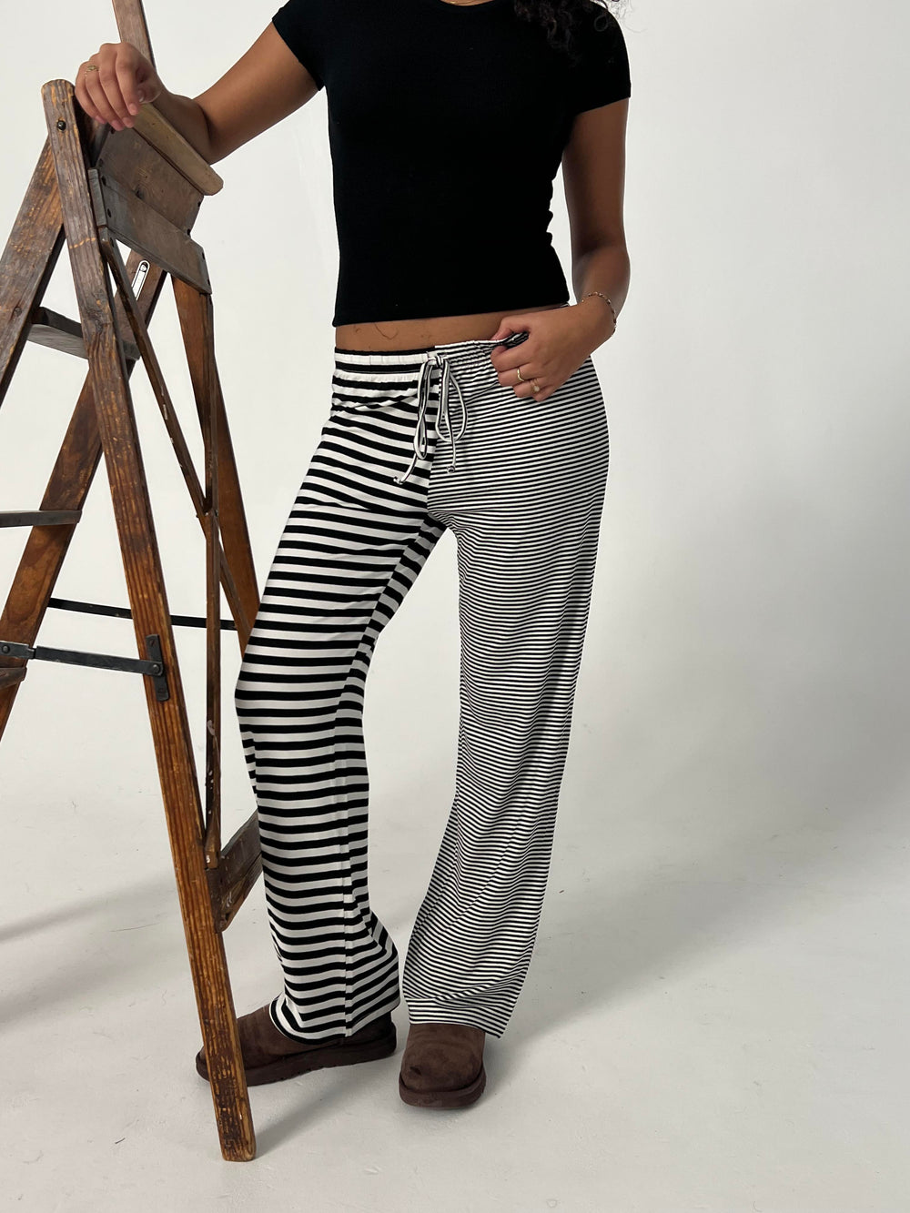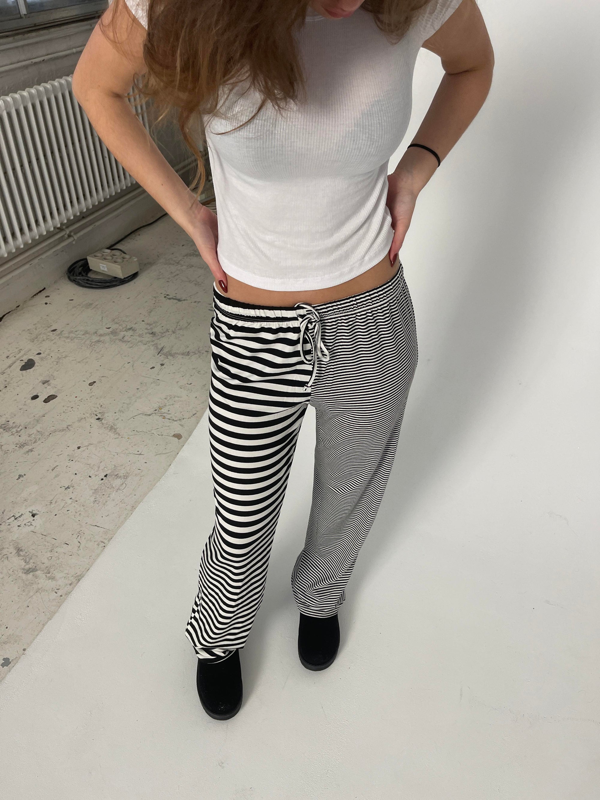 Pants with different stripes on each leg. They have a loose and comfortable fit and can be tightened at the waist. The trousers can be styled both low and mid waist.