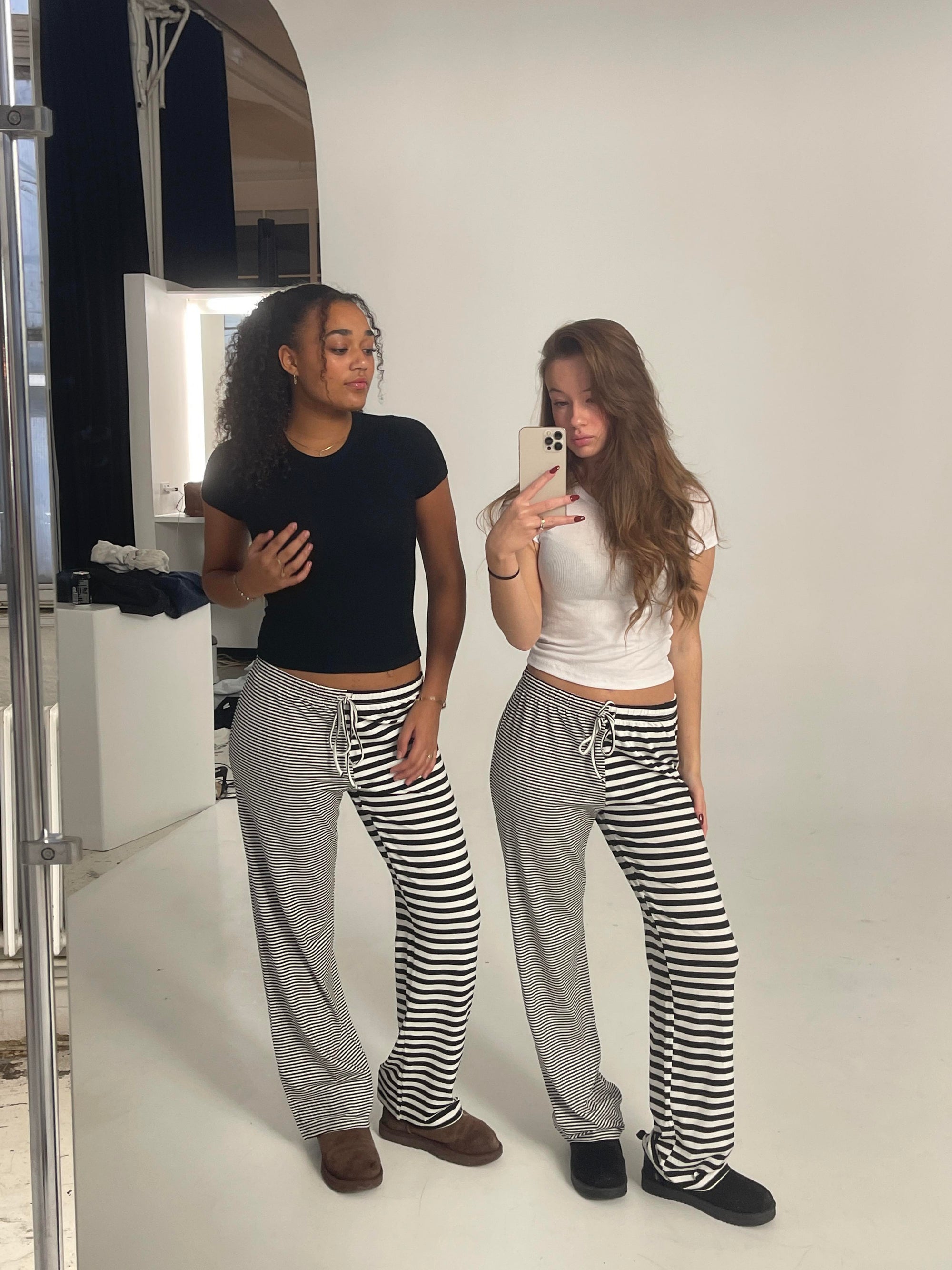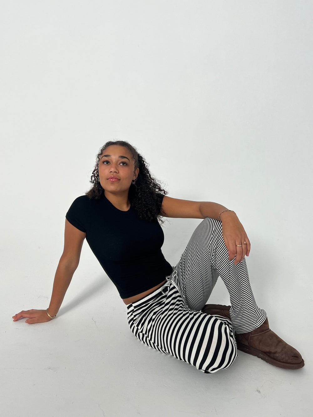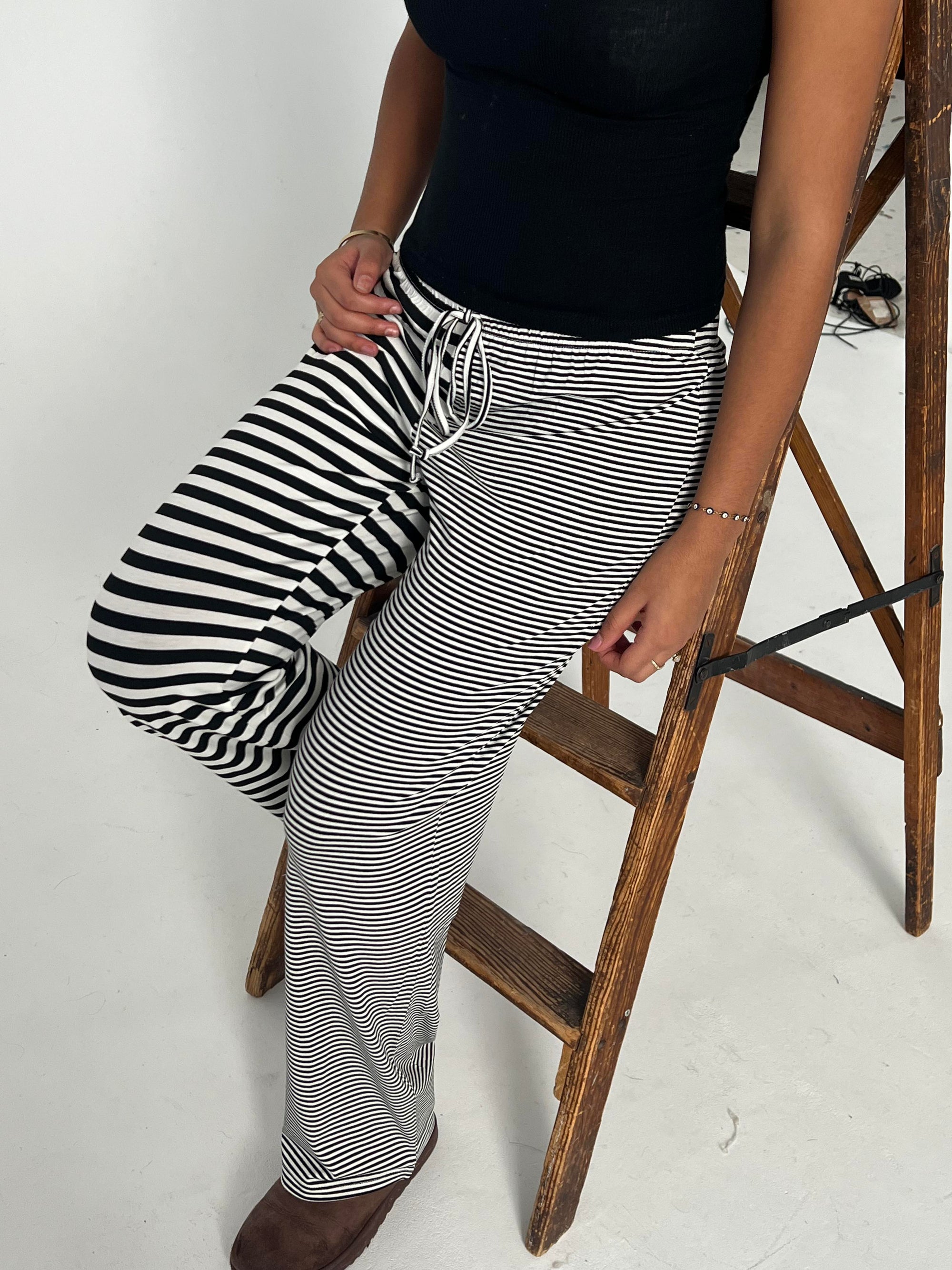 Pants with different stripes on each leg. They have a loose and comfortable fit and can be tightened at the waist. The trousers can be styled both low and mid waist.