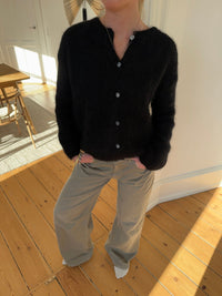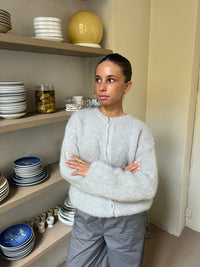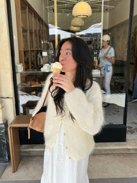 This cardigan is made of the softest material and can either be used as the main part of an outfit or over your outfit as an extra layer! The cardigan has the cutest buttons and a relaxed fit. It has a round collar and voluminous sleeves.