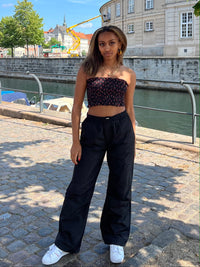Lesley trousers with elastic waist and side pockets. The trousers can be tightened at the bottom so they are baggy.
