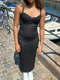 Long beautiful floral embroidered dress. The dress consists of thin straps and has a slit at the bottom center back.