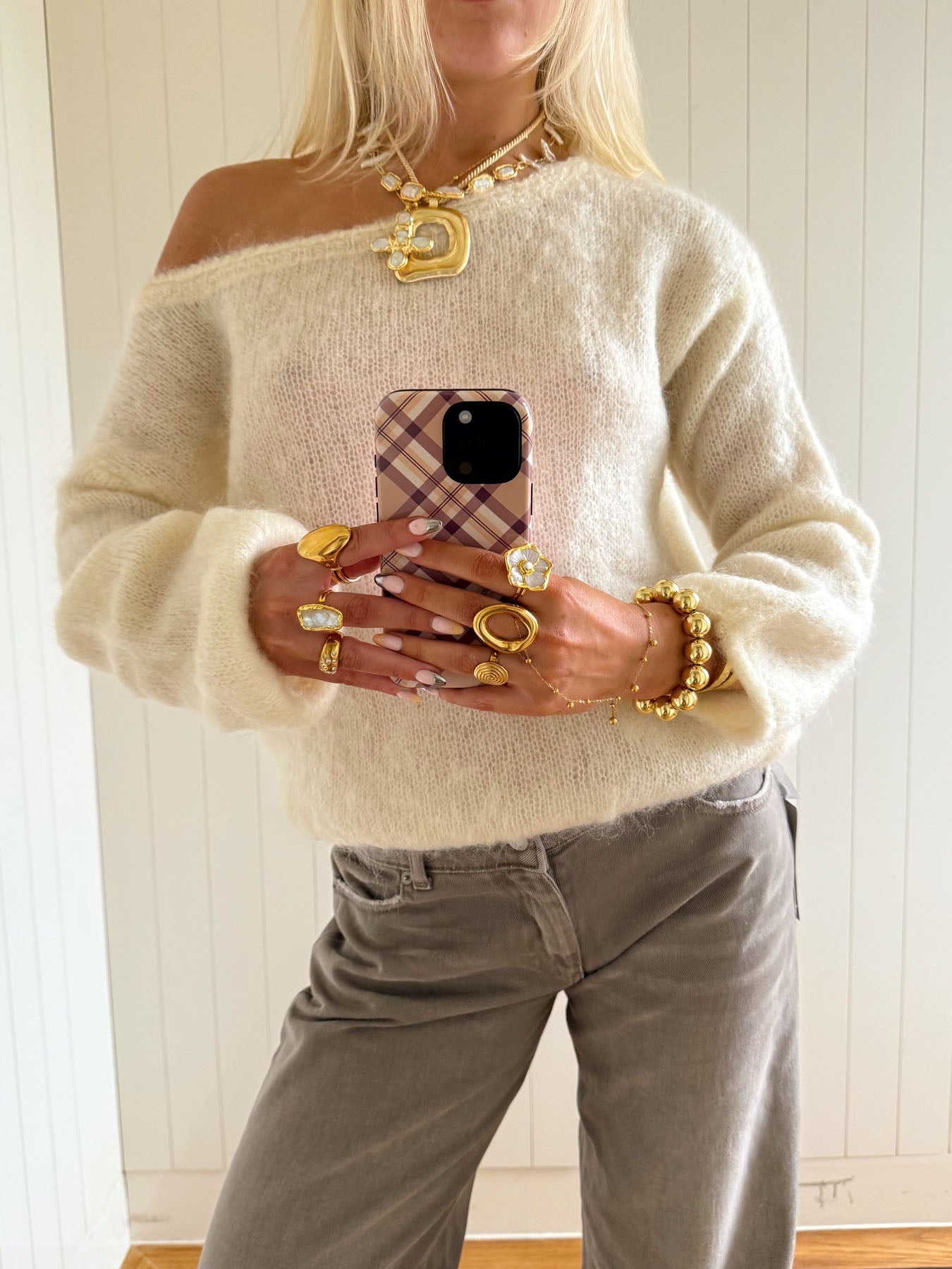 This soft and fluffy off-shoulder knit sweater gives a feminine and effortless look. The slightly loose fit drapes beautifully over the body, while the wide neckline makes it possible to style the sweater asymmetrically — perfect off one shoulder. The fine, cream-coloured shade makes it easy to combine with both jeans, skirts, and elegant trousers.