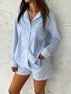 Our Avana striped pajama shirt consists of a collar and has buttons at the front that can be closed. The shirt has an open pocket on the chest. Goes perfectly with our Avana striped pajama pants or Avana striped pajama shorts.