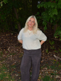 This short-sleeve knit sweater is made from a soft material with a mohair blend, providing a luxurious feel. It features an elegant V-neck that adds a feminine touch and a fine, loose fit that makes it comfortable to wear. Perfect for layering or as a light, relaxed look.