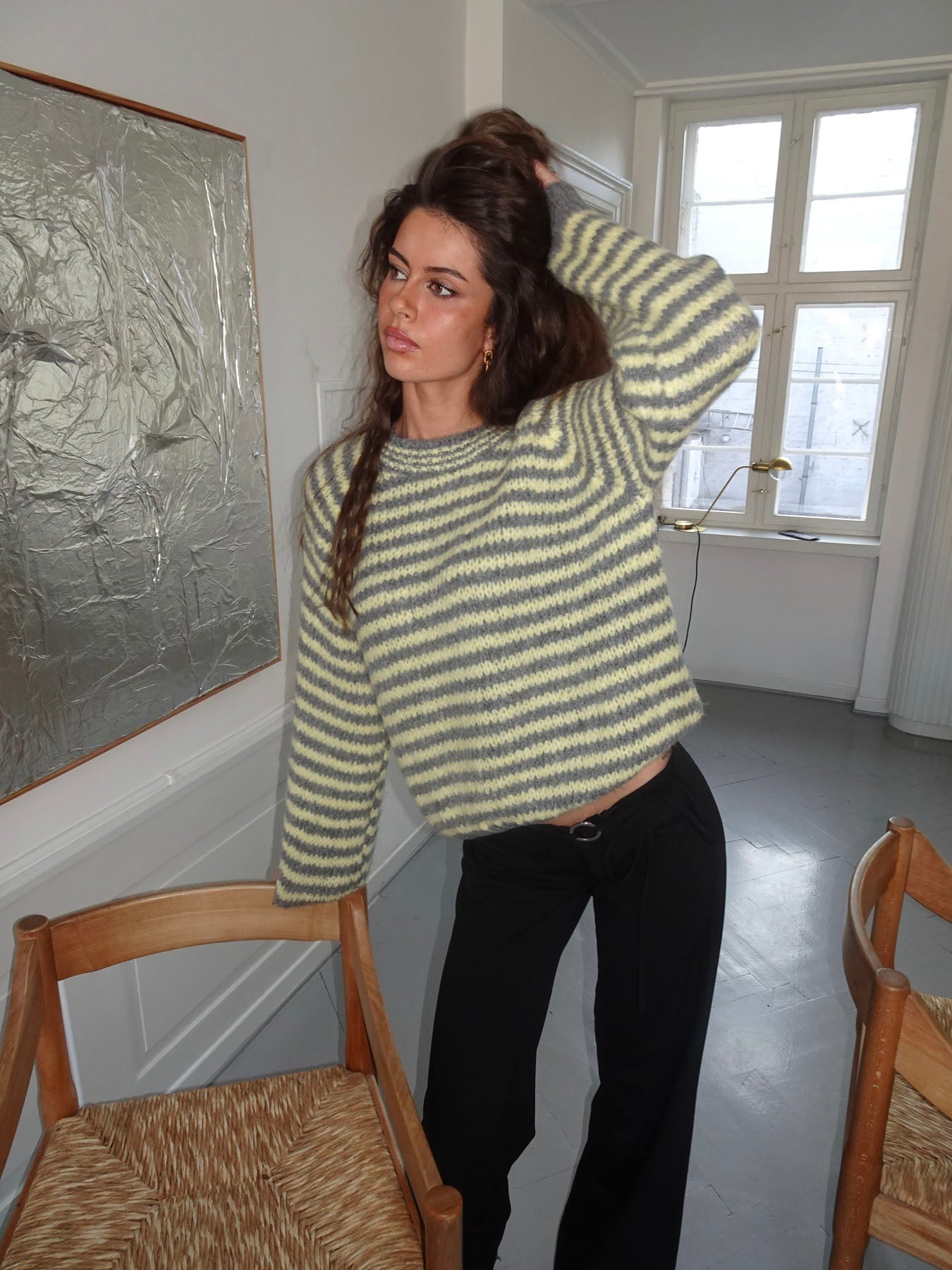 The Zeya knit is a soft and feminine sweater with delicate yellow and grey stripes, creating a calm and harmonious look. The relaxed fit and long sleeves make it comfortable to wear and easy to style with jeans, trousers, or skirts. The color combination gives it a light and elegant expression that works perfectly for both everyday wear and more relaxed occasions.