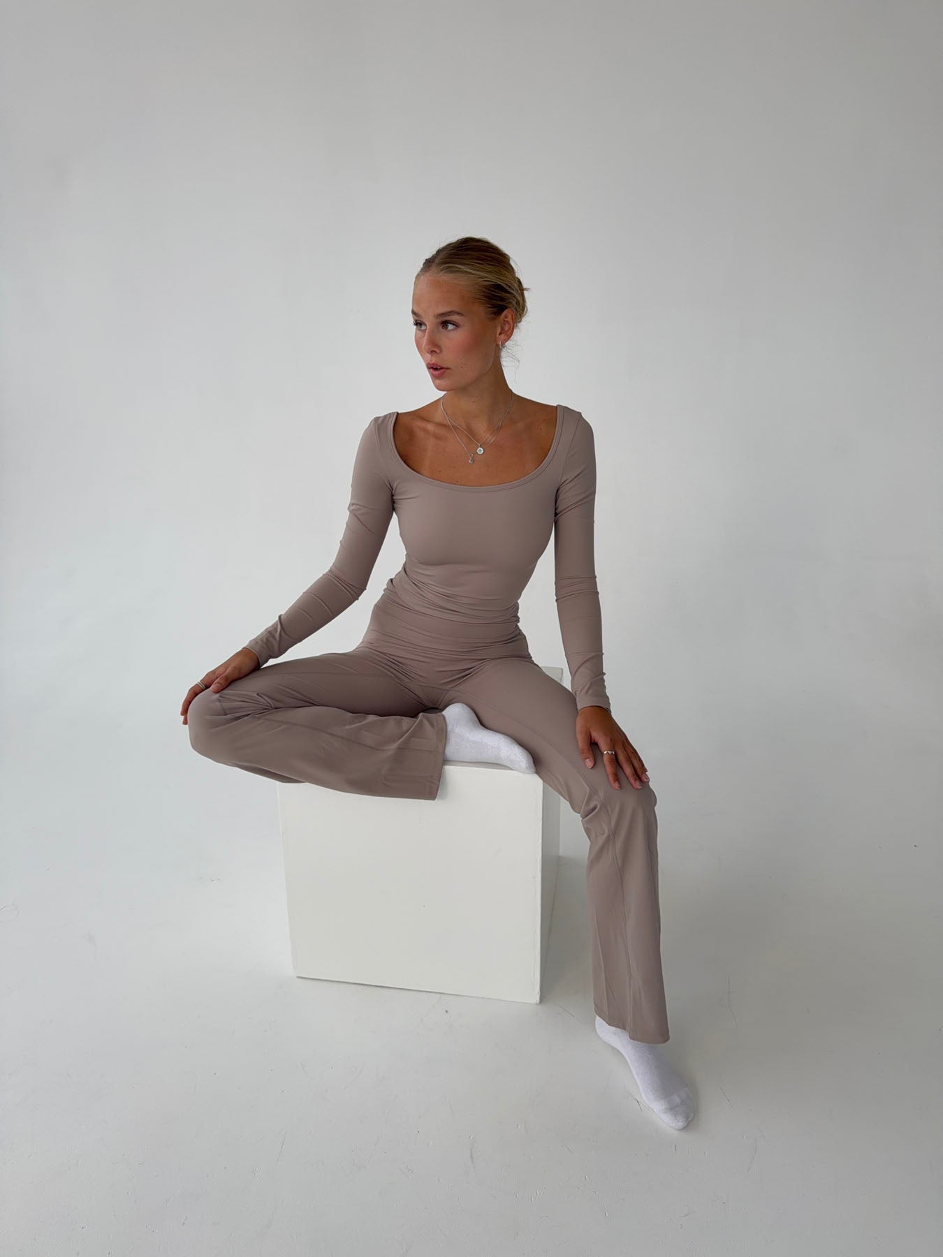 This taupe-grey training top combines functionality with a sleek, feminine design. The soft, breathable material provides maximum freedom of movement and comfort during workouts, while the fitted silhouette and rounded square neckline create a modern and flattering look.