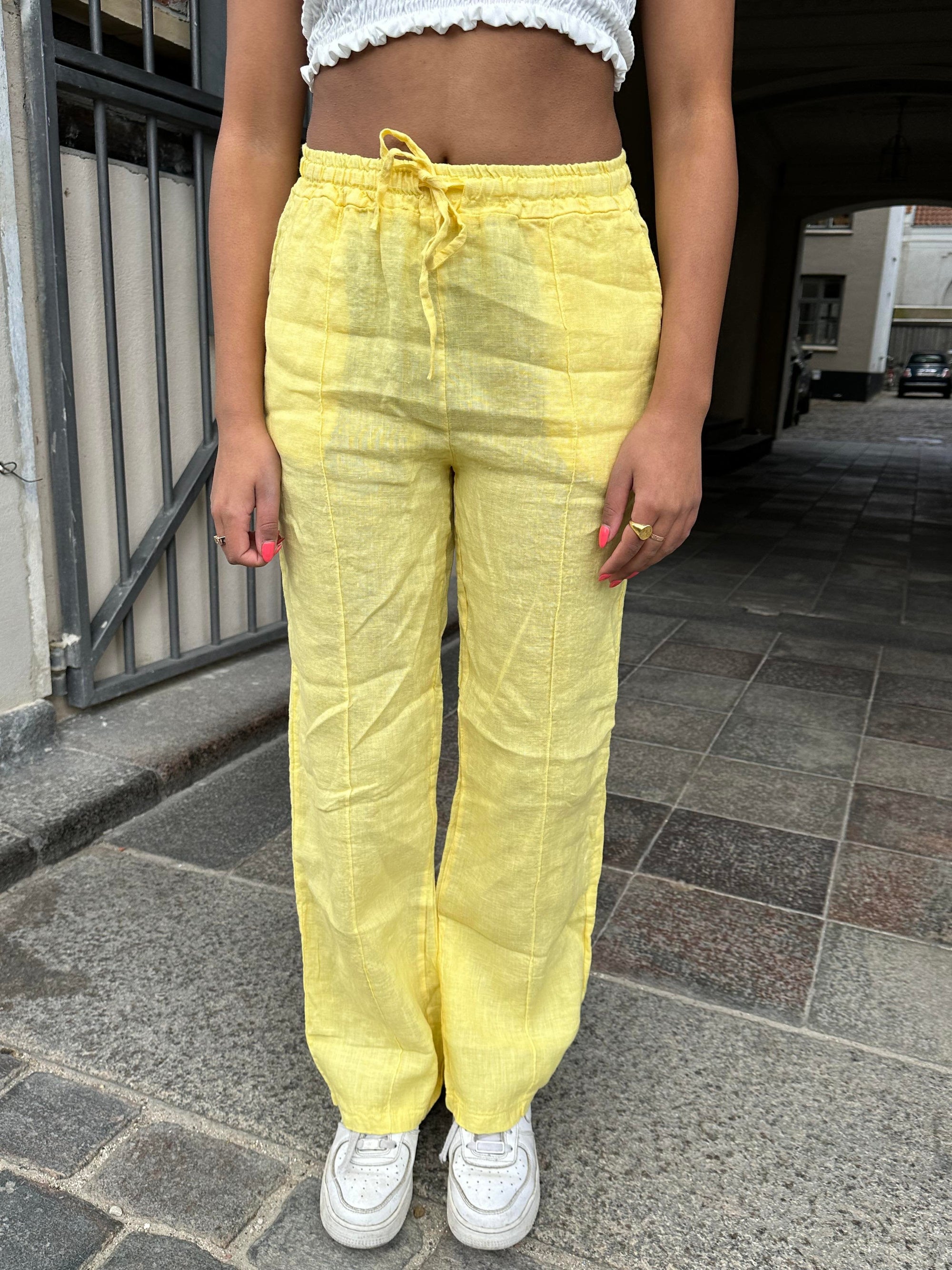 Signe linen pants with a loose fit, elastic waistband and pockets at the sides, as well as a decorative pocket at the back.