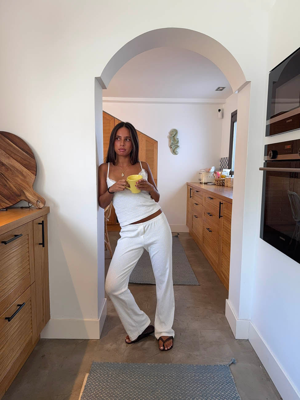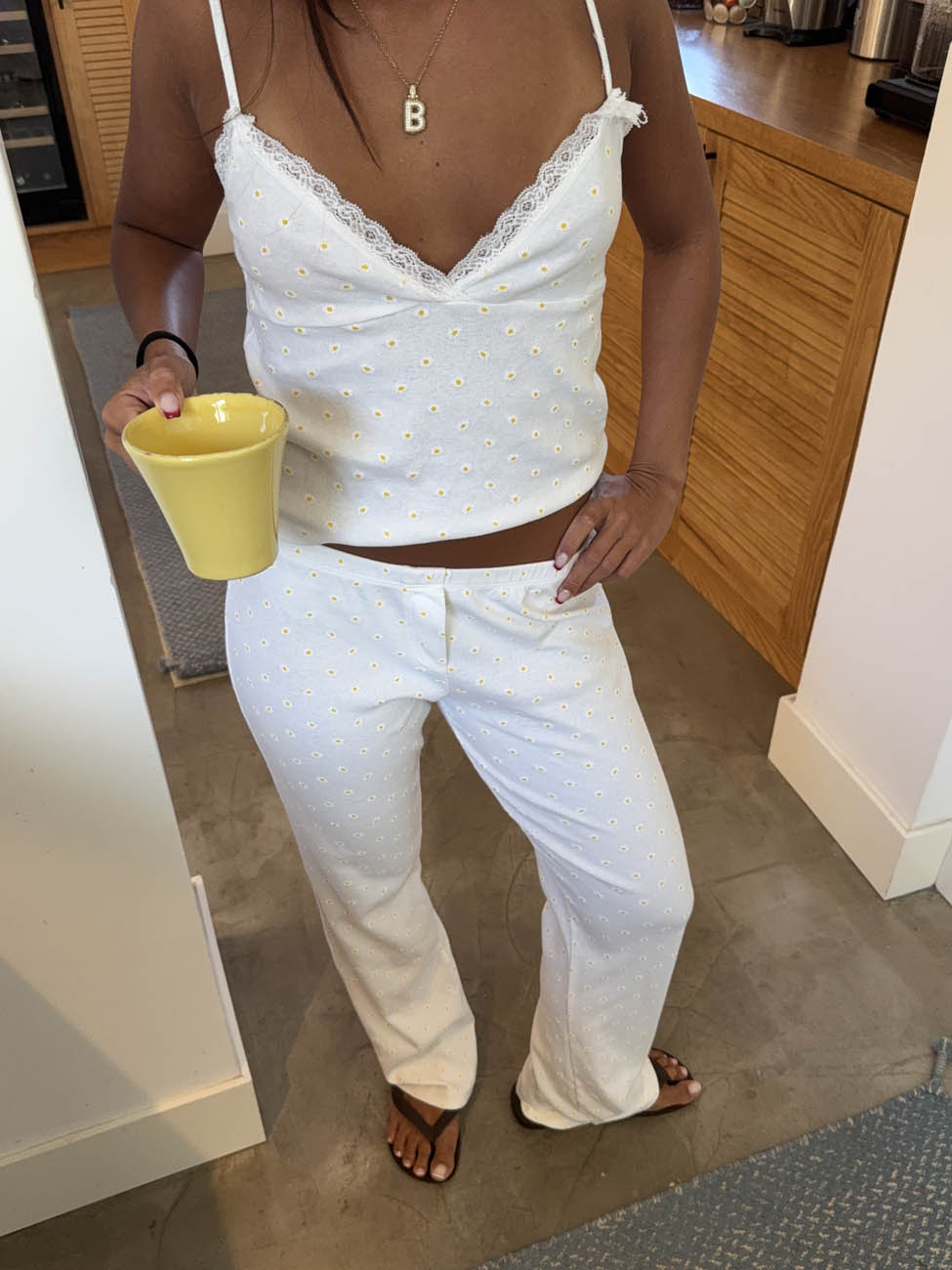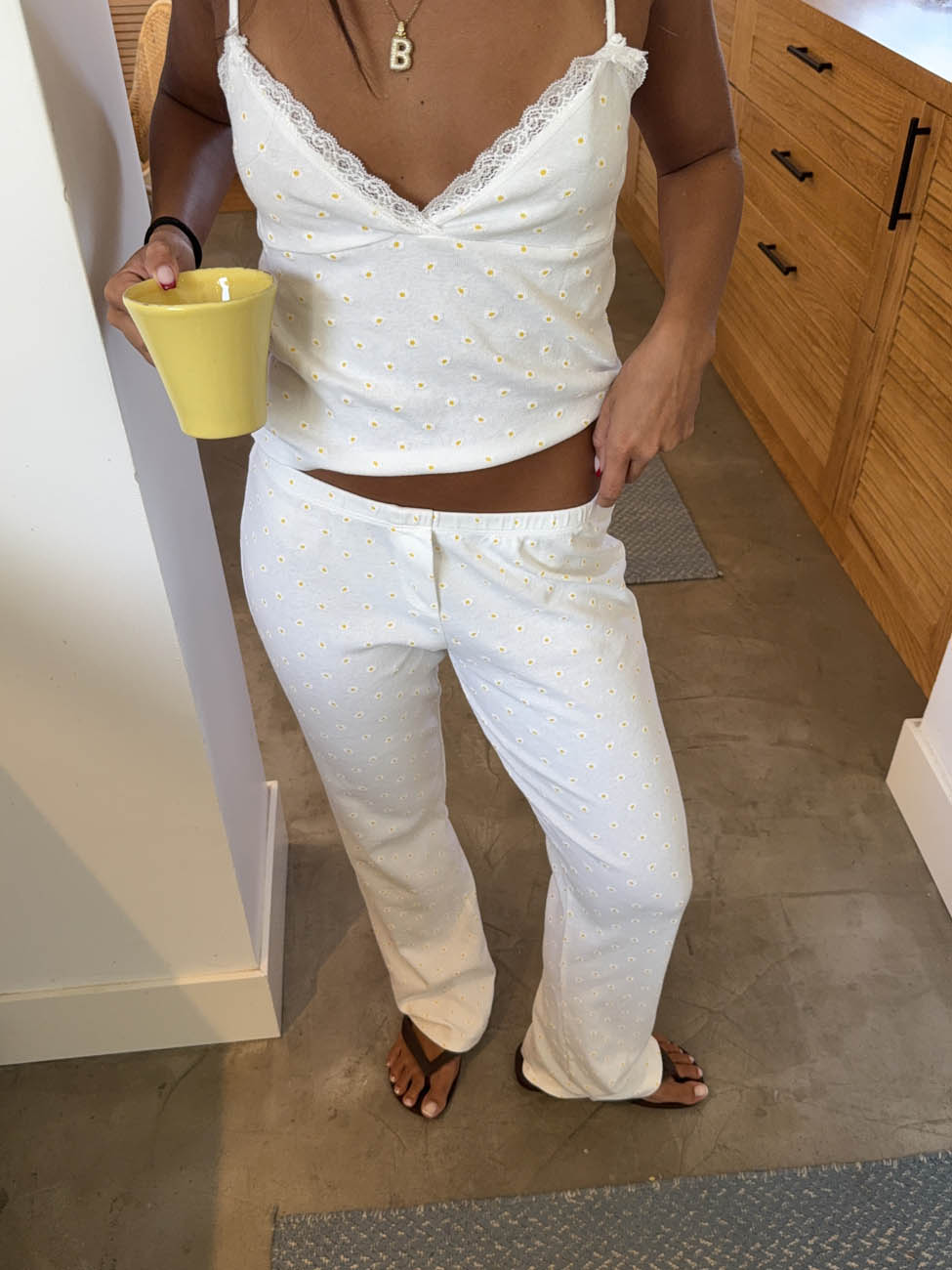 These white trousers with small yellow flowers combine a relaxed fit with a fresh and feminine expression. The soft cotton fabric and elastic waistband ensure maximum comfort, while the simple floral pattern adds a touch of summery charm. Perfect as casual loungewear, for a relaxed day out, or as part of a cozy set with the matching top or shorts.